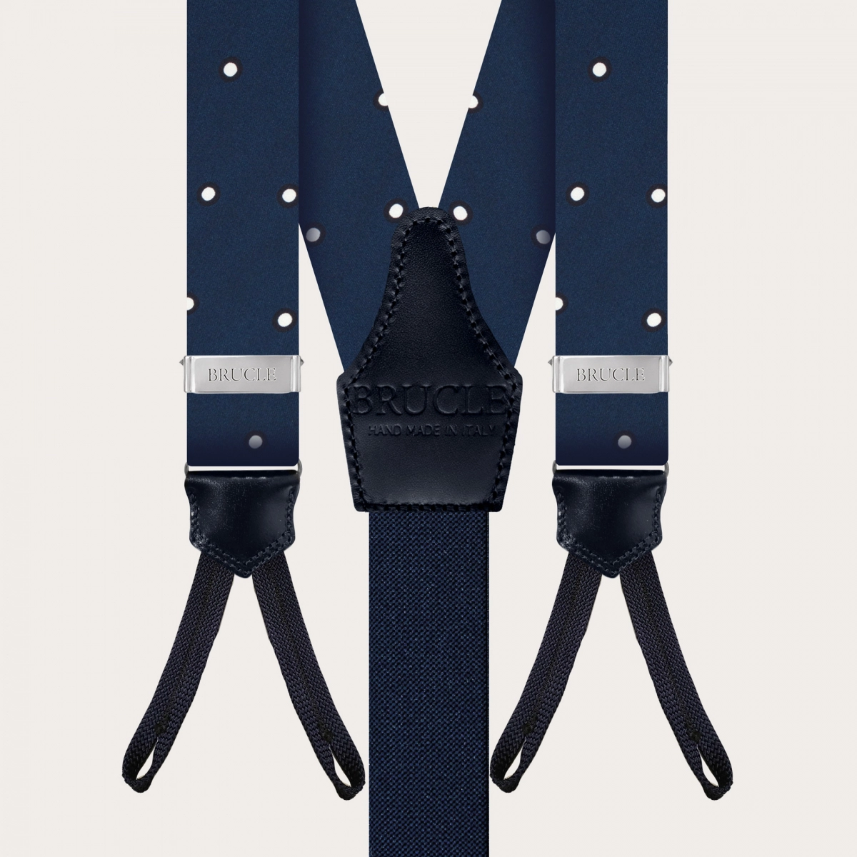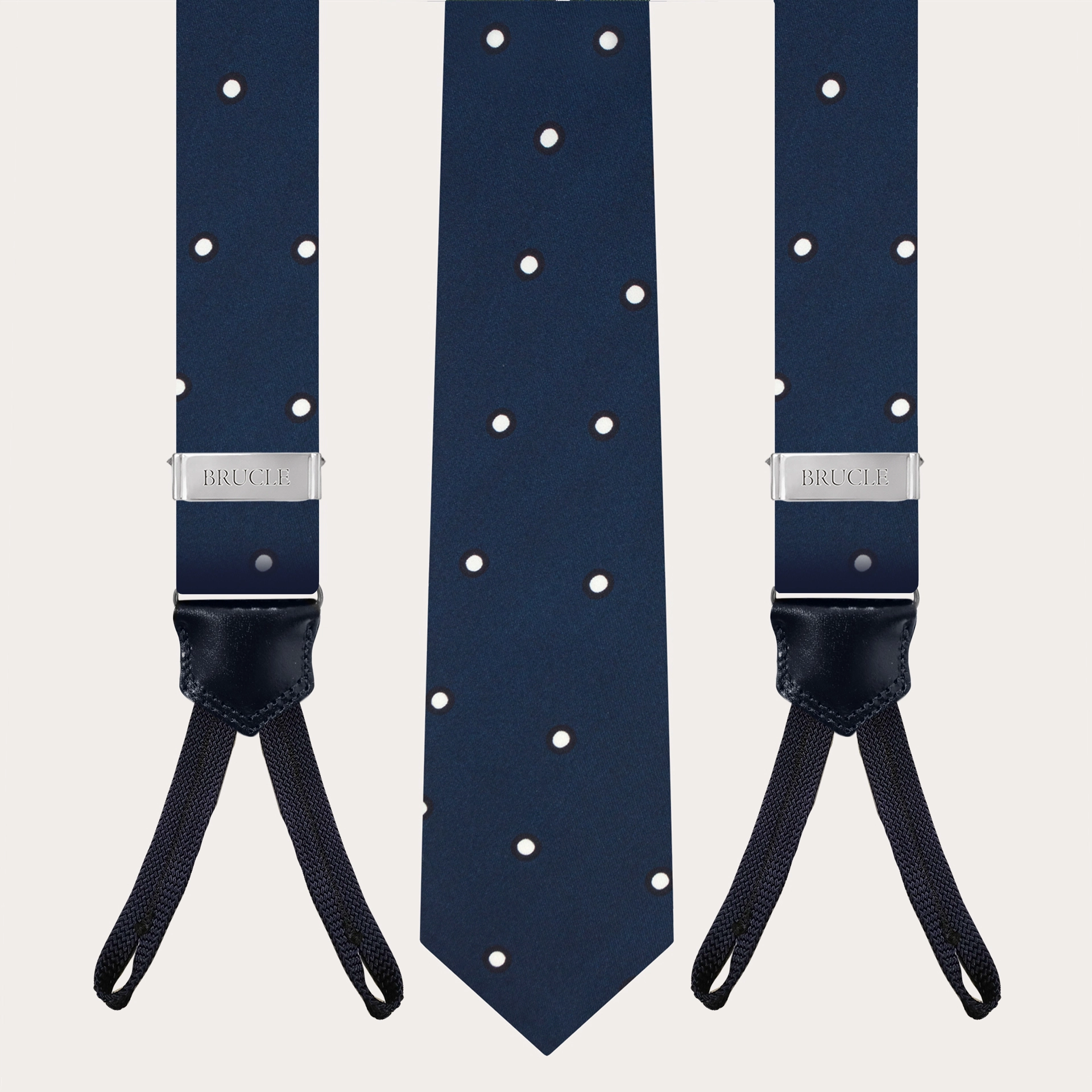 Discover the elegant men's suspenders by Brucle in diamond jacquard silk with a blue pin dot design, a masterpiece of craftsmanship that truly embodies the Made in Italy essence.
