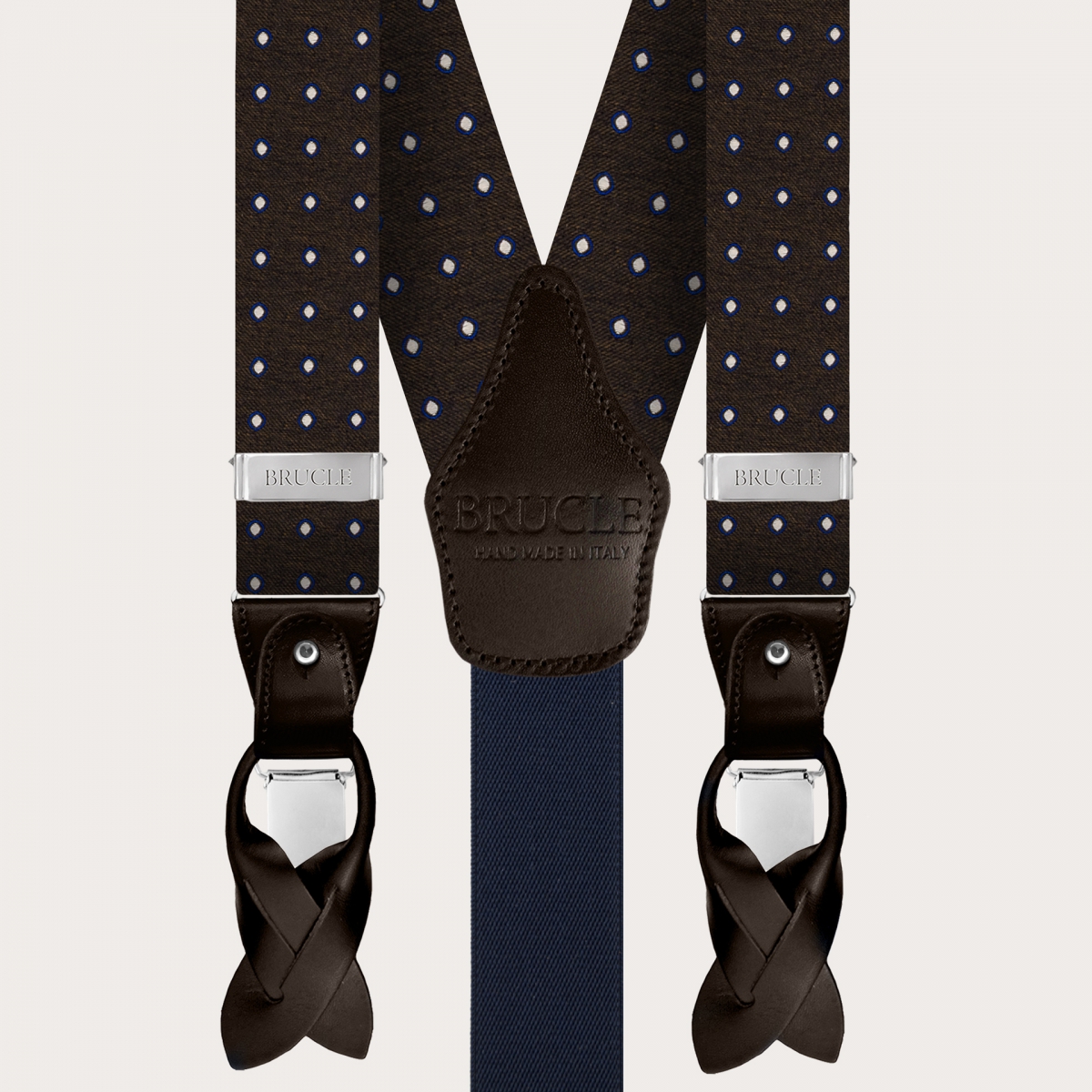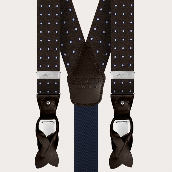 Package consisting of suspenders and bow tie brown in an original variation on the classic dotted pattern. 100% Made in Italy.