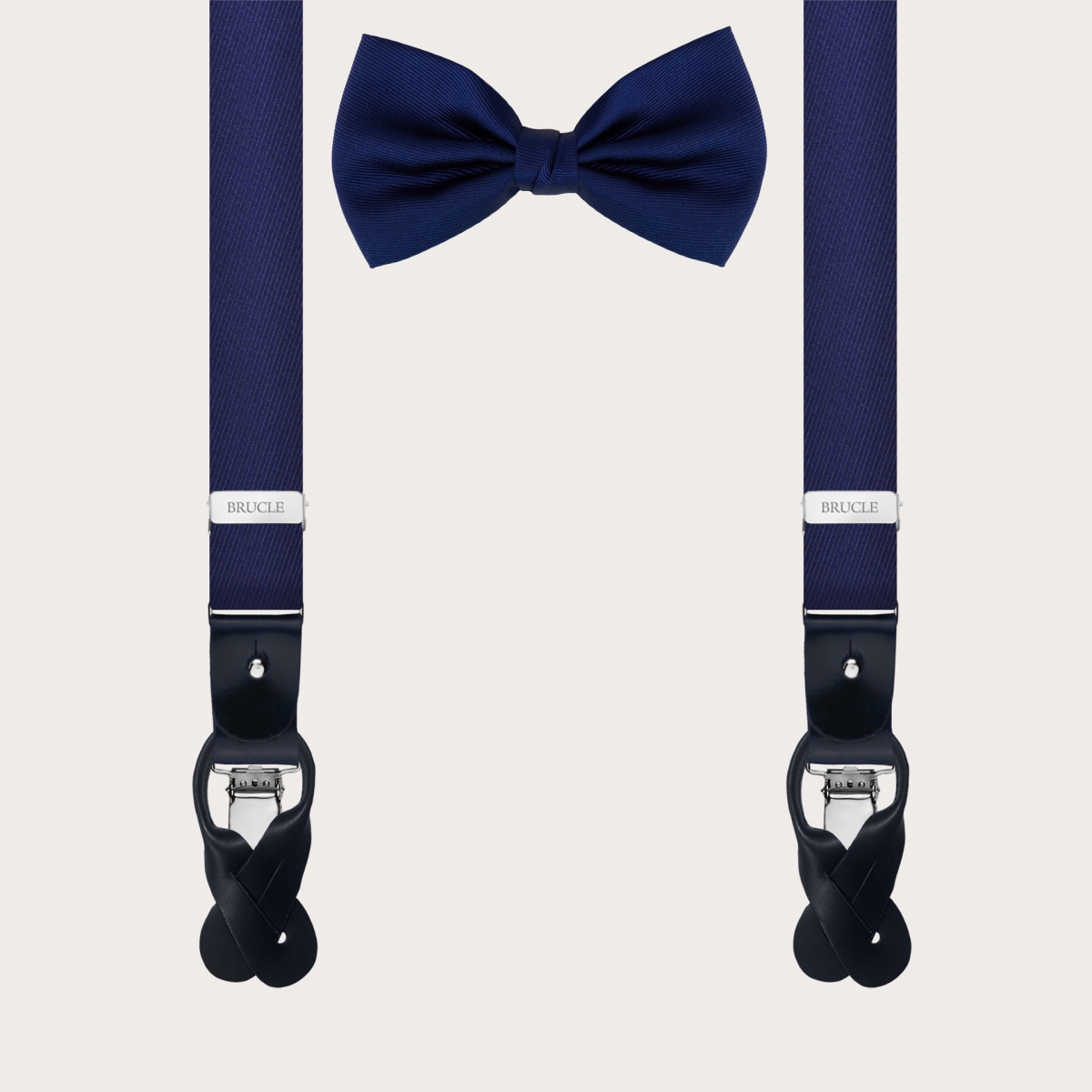 Elegant ceremony set consisting of blue silk suspenders and coordinated silk satin bow tie of the same color. Perfect for any formal occasion.