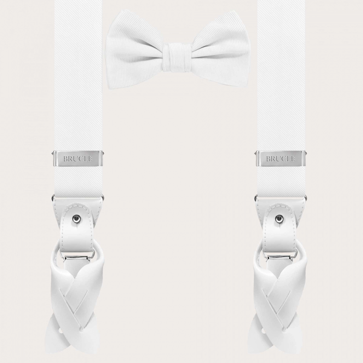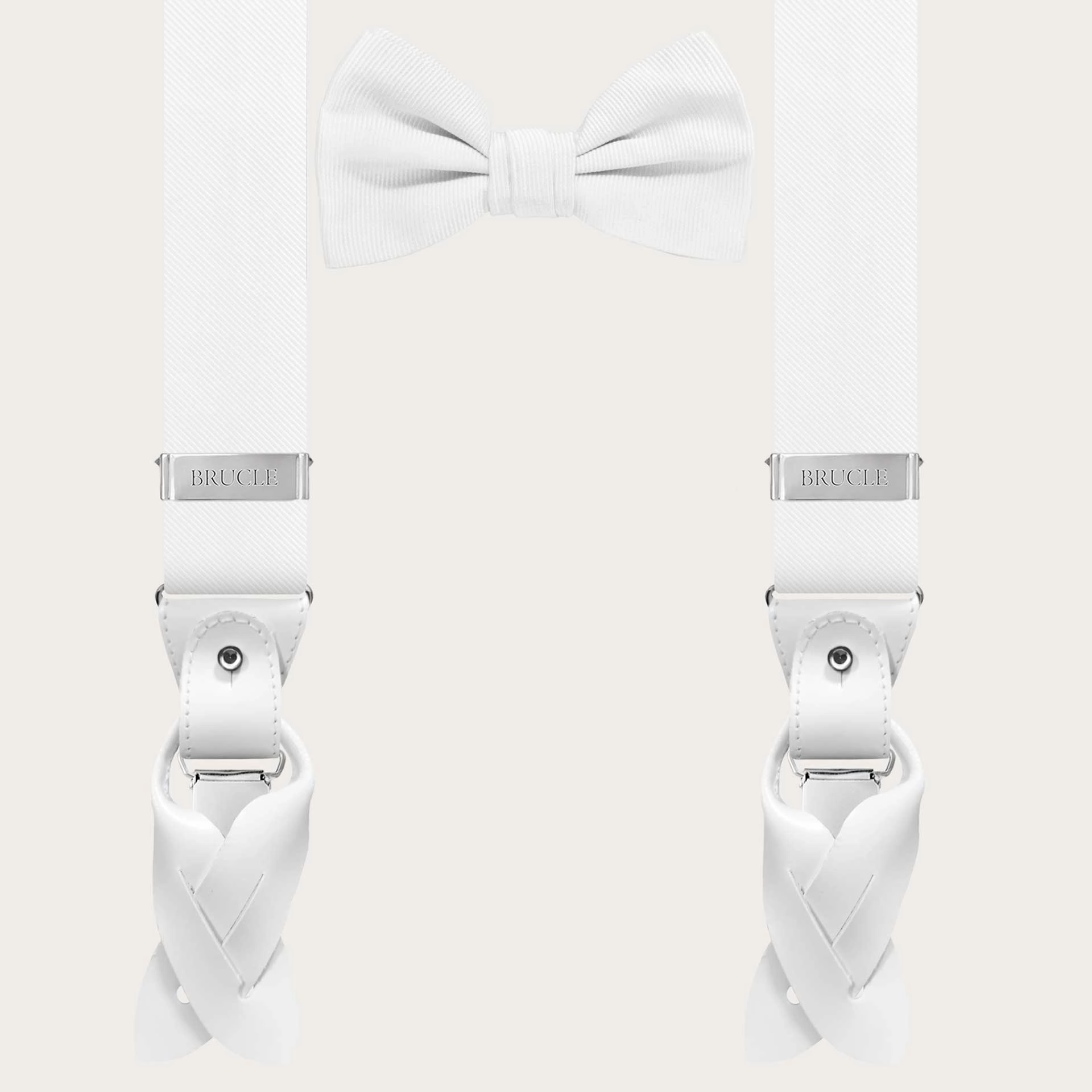 Classic and timeless set of coordinated white suspenders and bow tie in jacquard silk. Thanks to the fine craftsmanship in 74-thread jacquard silk woven in Como, the genuine cowhide leather finishes, and the artisanal production, this set is high-quality and perfect for weddings, ceremonies, and formal events. Like all sets with BRUCLE suspenders, this one can be personalized with engravings on clips and leather parts, to make it even more exclusive.