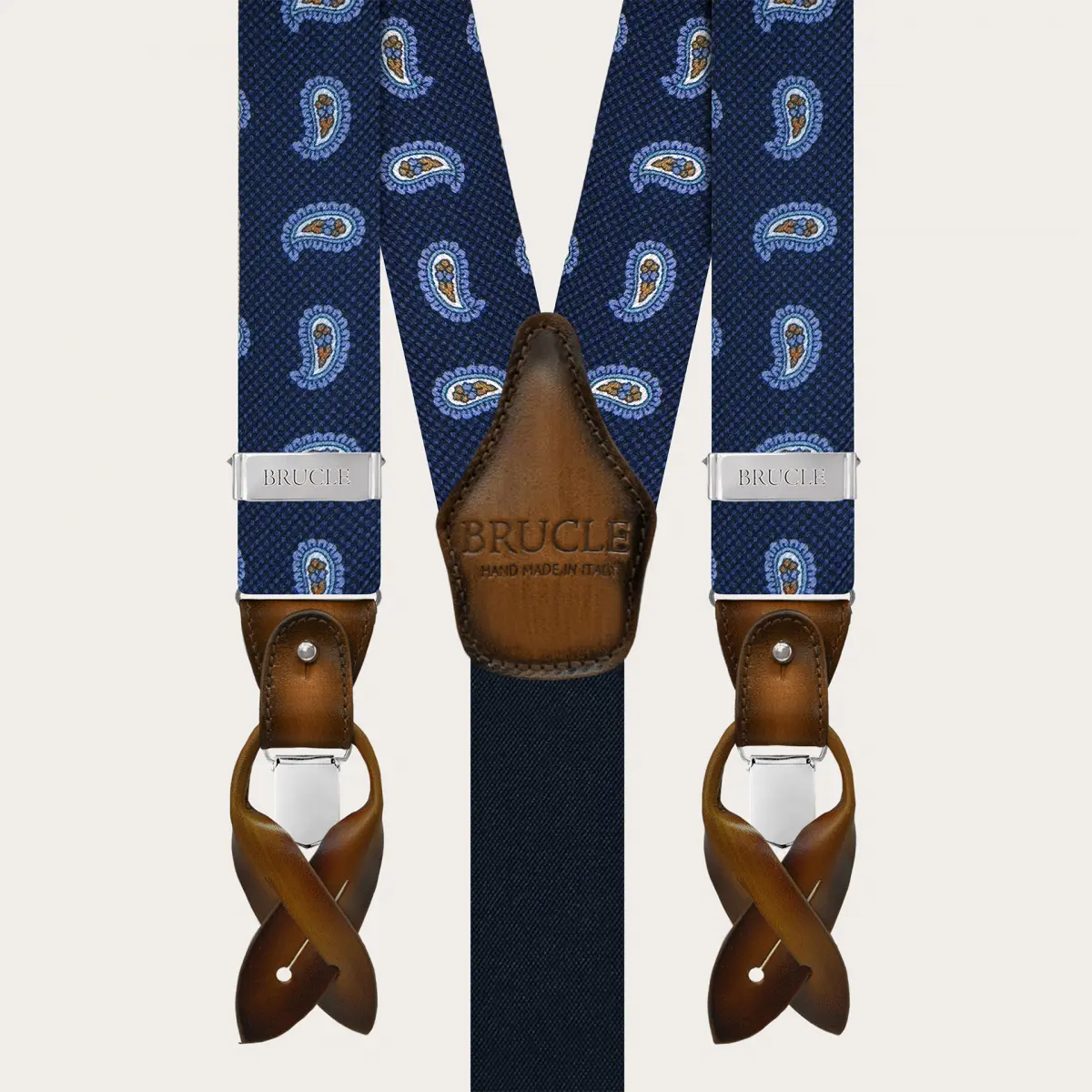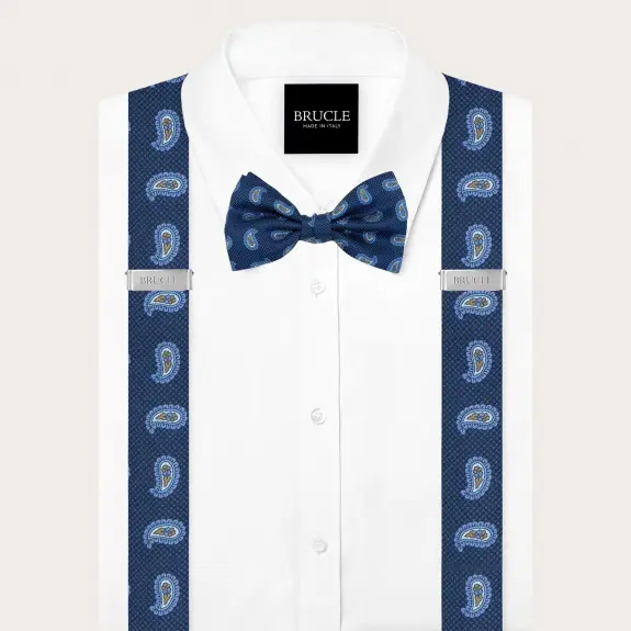 Coordinated suspenders and bow tie in blue paisley silk
