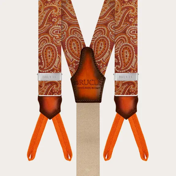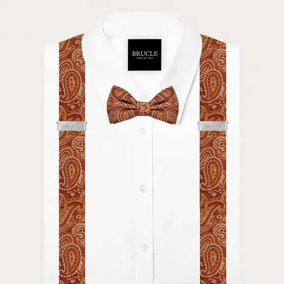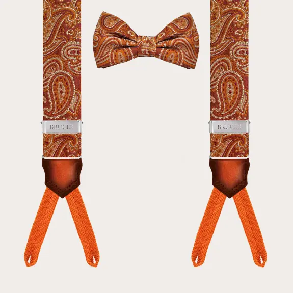 Refined ceremony set for men, consisting of silk button suspenders with an orange paisley pattern and a matching pre-tied bow tie, both crafted from the same fine silk.