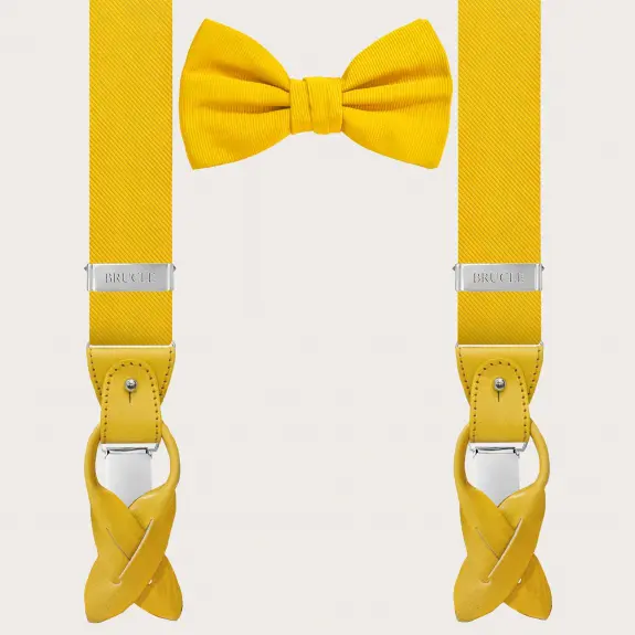 Coordinated set of yellow suspenders and bow tie in jacquard silk, 100% Made in Italy.