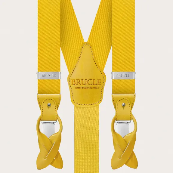 The yellow bow tie is pre-tied and ready to wear. The yellow silk suspenders are dual-use and can be worn with buttons for an elegant look, or alternatively with clips for a practical and less formal style.