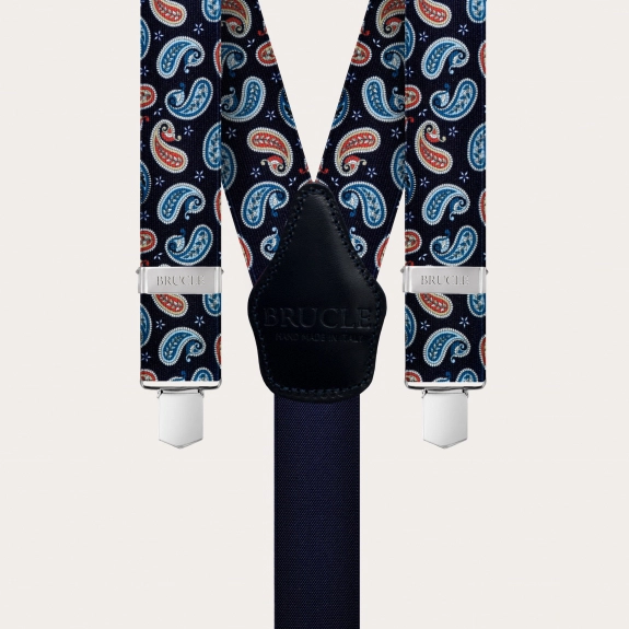Luminous satin-effect elastic suspenders with a colorful navy blue paisley pattern with blue and red accents. These suspenders are embellished with a vegetable-tanned leather dorsal. Impress with your 100% Made in Italy look.
