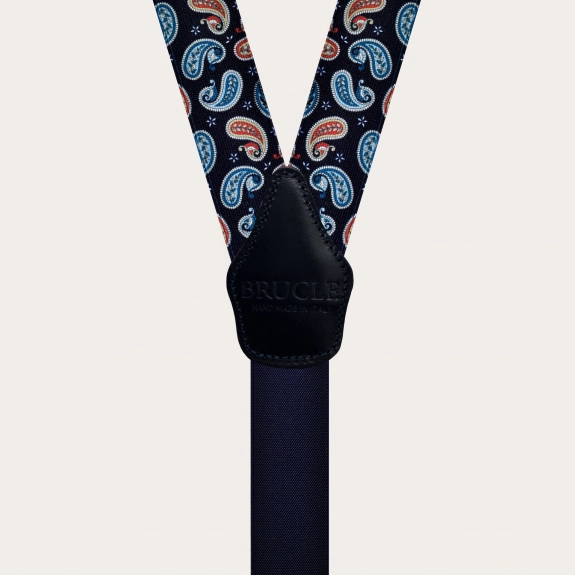 Y-shape suspenders with satin effect, navy blue paisley pattern