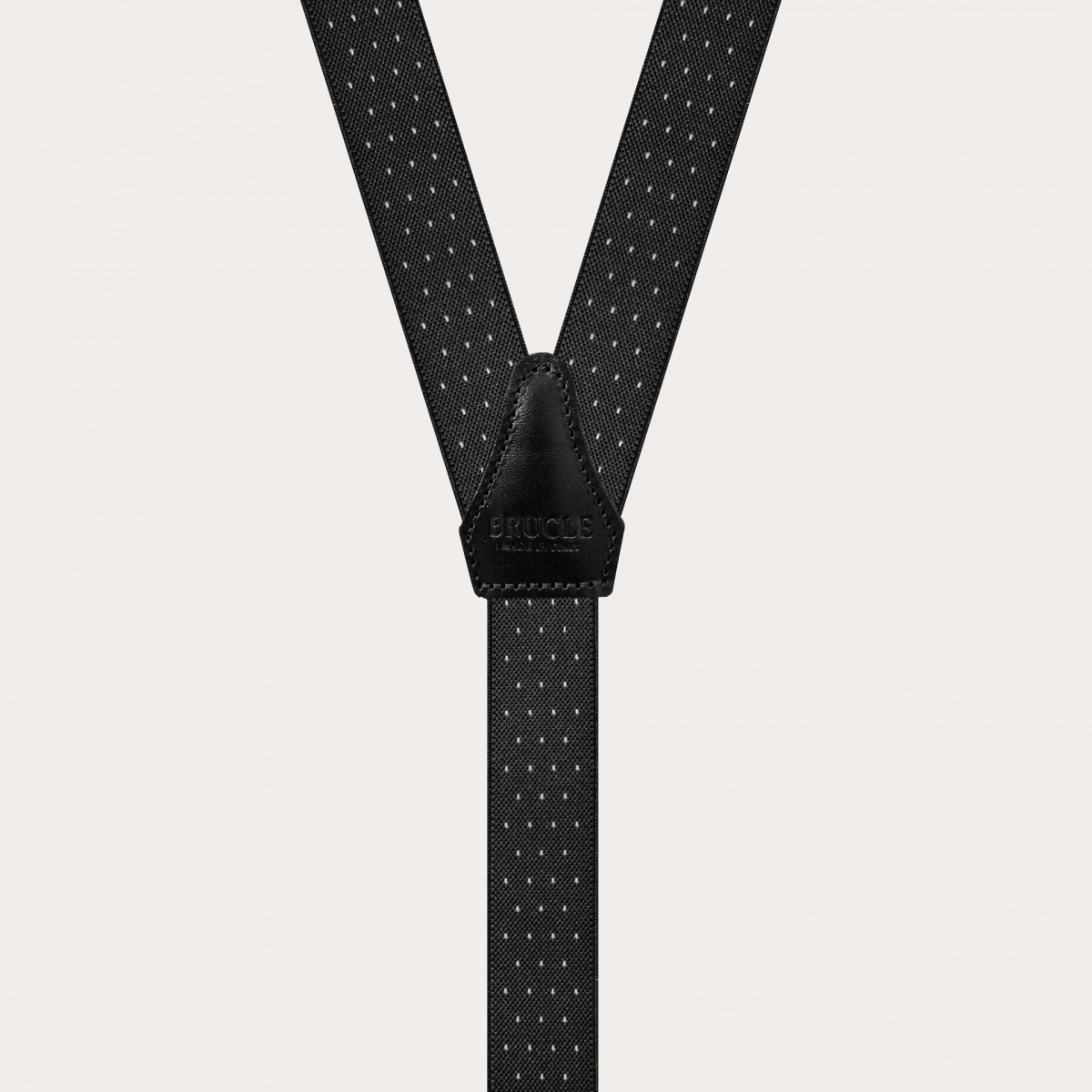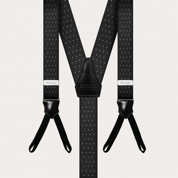 Black pin-dot suspenders with fabric buttonholes, to be worn exclusively with buttons. An elegant suspender model, entirely handmade in Italy with high-quality materials and attention to every detail. Customize them by engraving your initials on the leather ends to make them truly unique. Discover all the available colors in our collection.