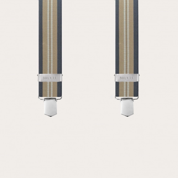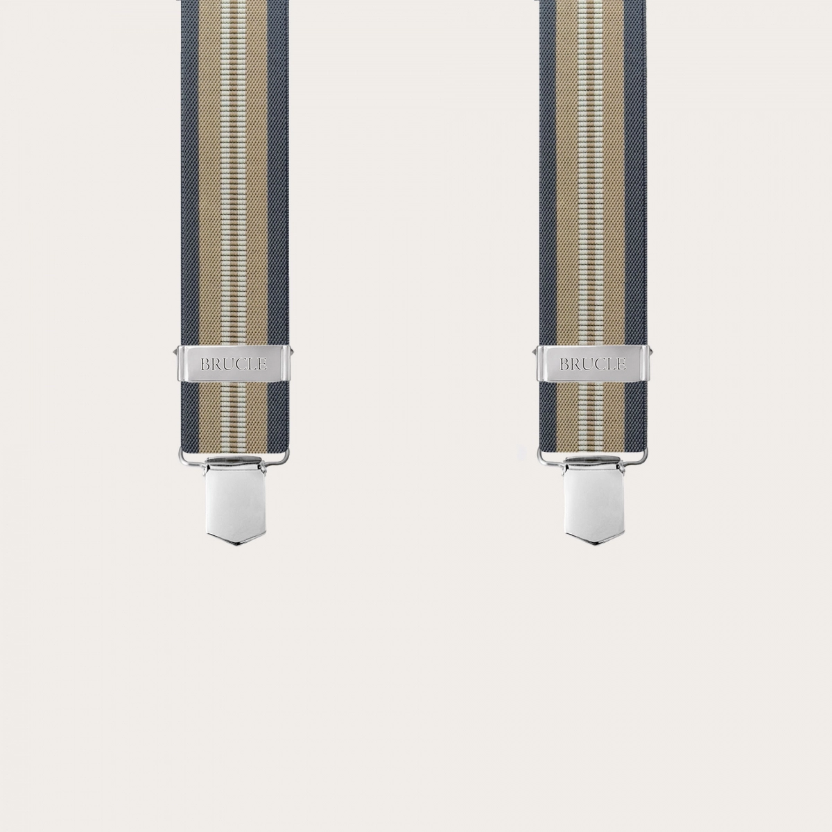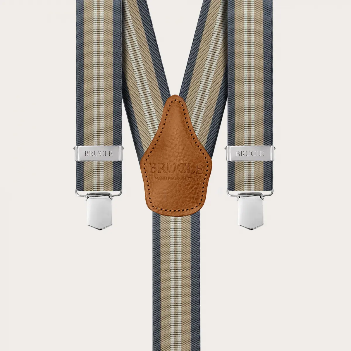 Beige suspenders withblue stripes, fastened only with clips, entirely handmade in Italy. A versatile, unisex model, enriched with a back piece in soft, grain-textured bovine leather. Customize with engravings on the clips to give these suspenders an even more unique and personal style.