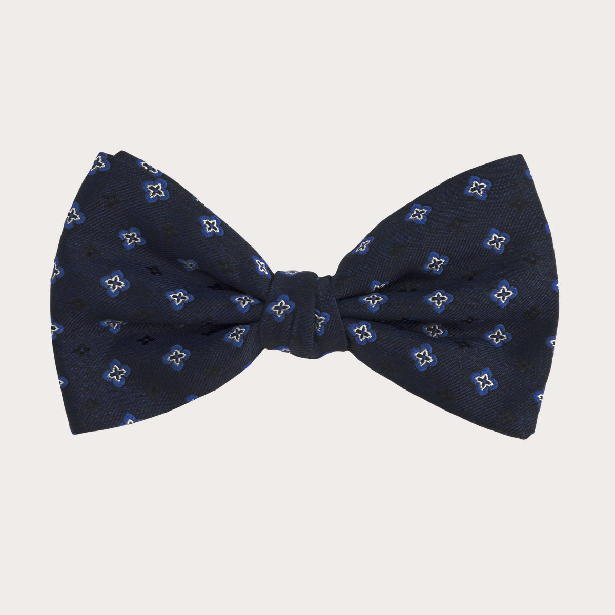 Elegant navy blue jacquard silk bow tie with light blue and white floral geometric pattern.