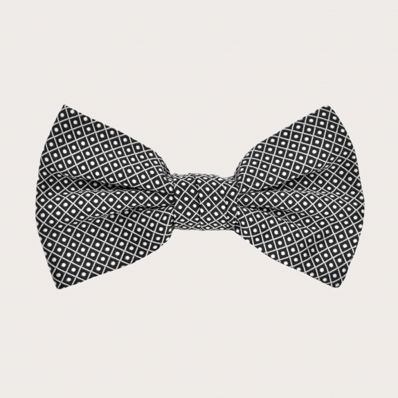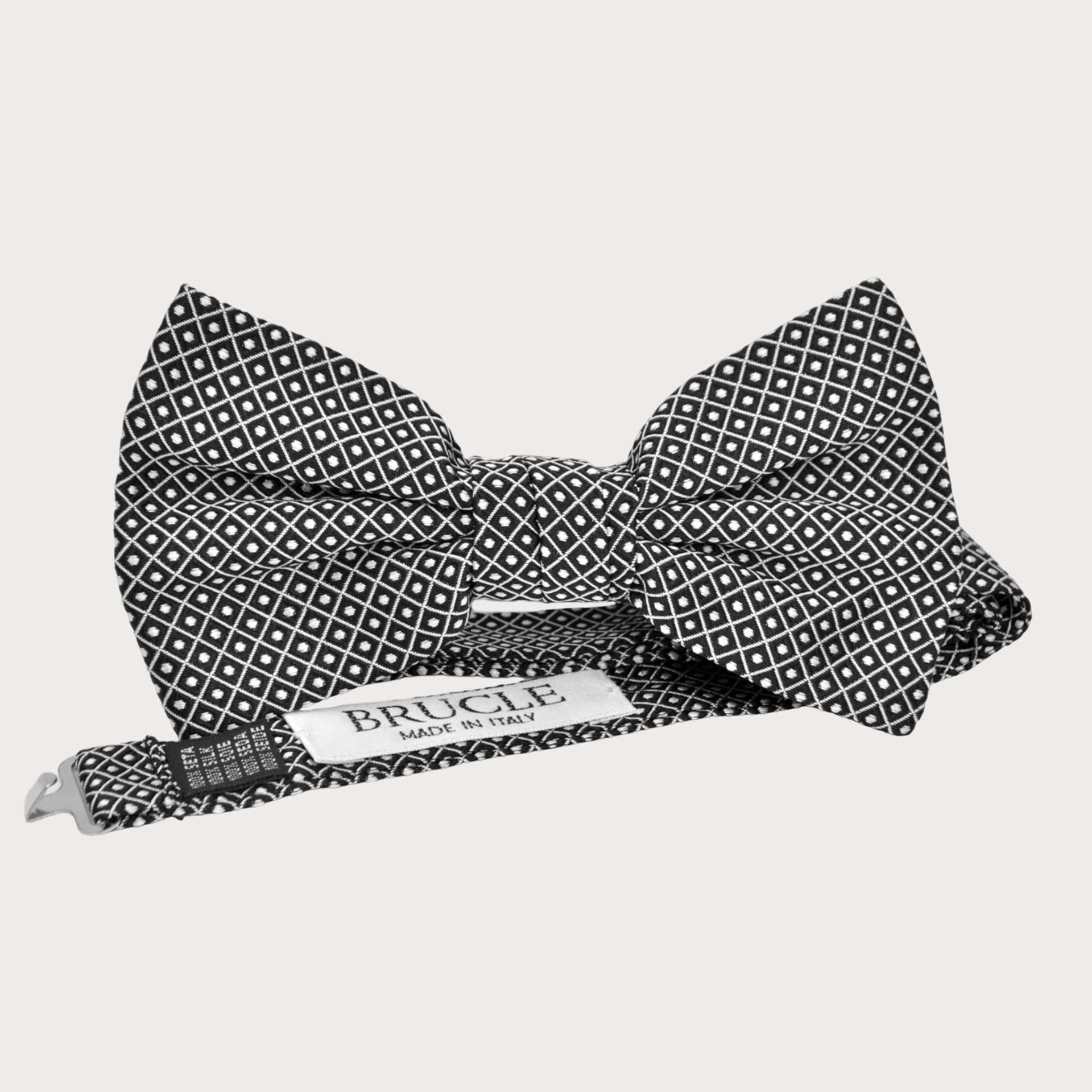 This black pin-dot men's bow tie is made from pure silk with jacquard weaving in Como, a world excellence in silk yarns.