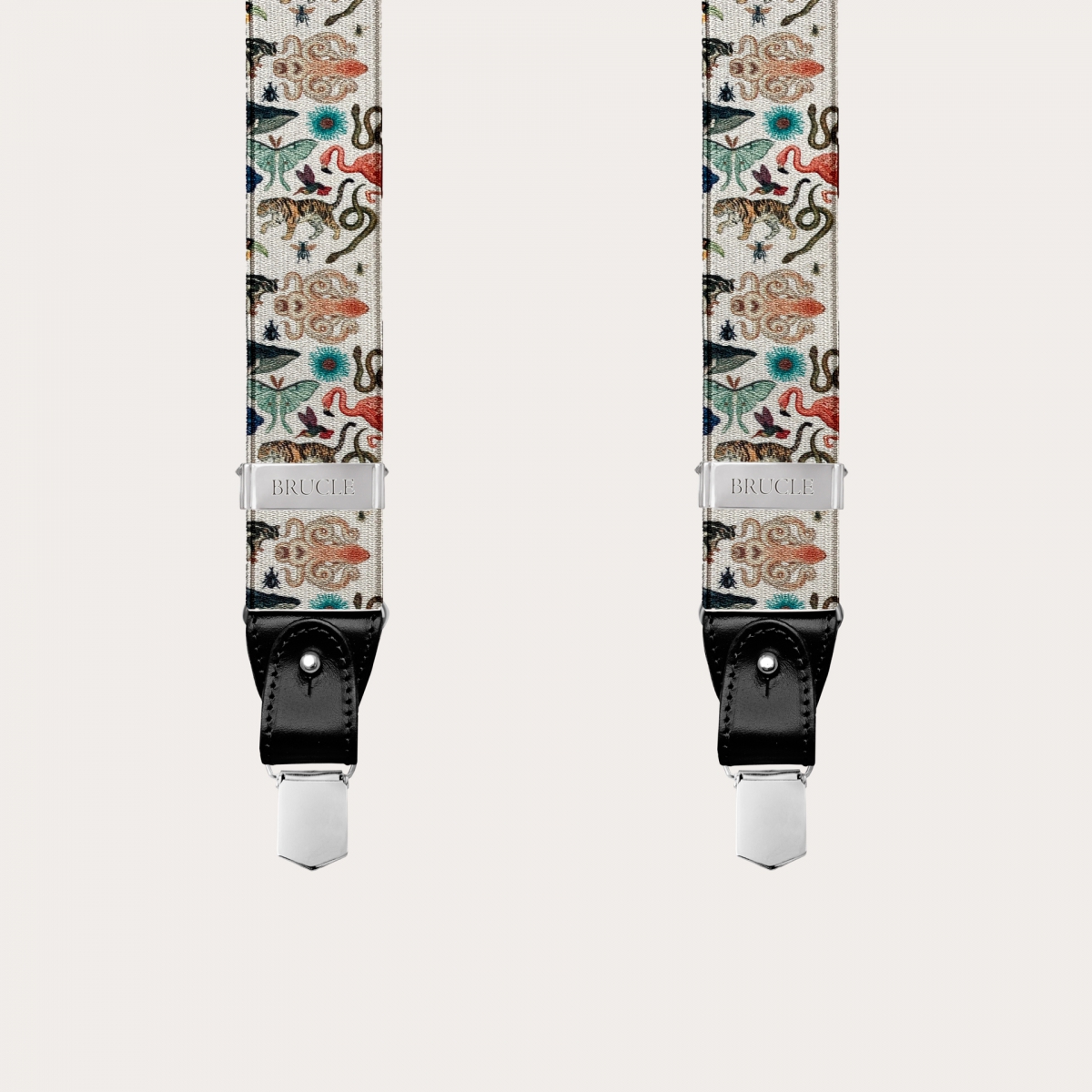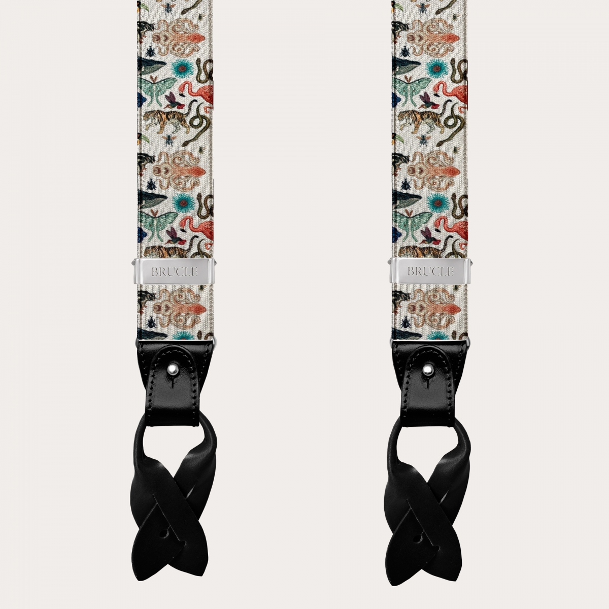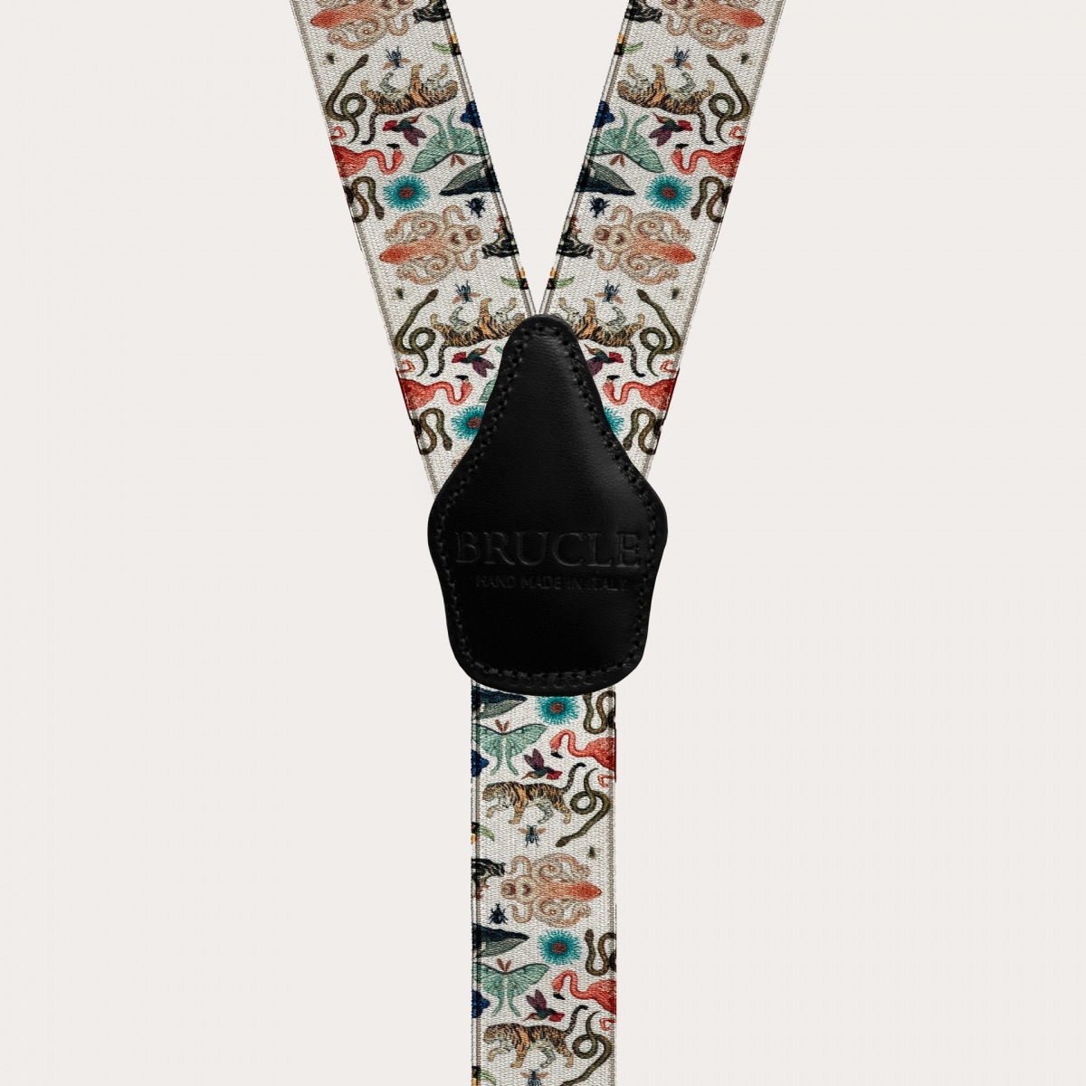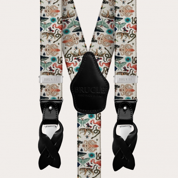 Elastic suspenders with a warm and original wheel pattern, with a design that recalls the summer sun and at the same time the idea of life that cyclically returns to be reborn. Embellished with elegant vegetable colored leather parts, these suspenders are suitable for occasions in which you want to amaze.