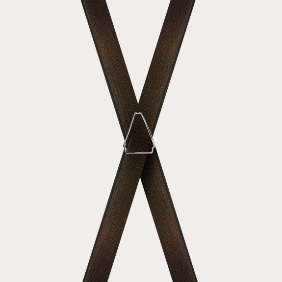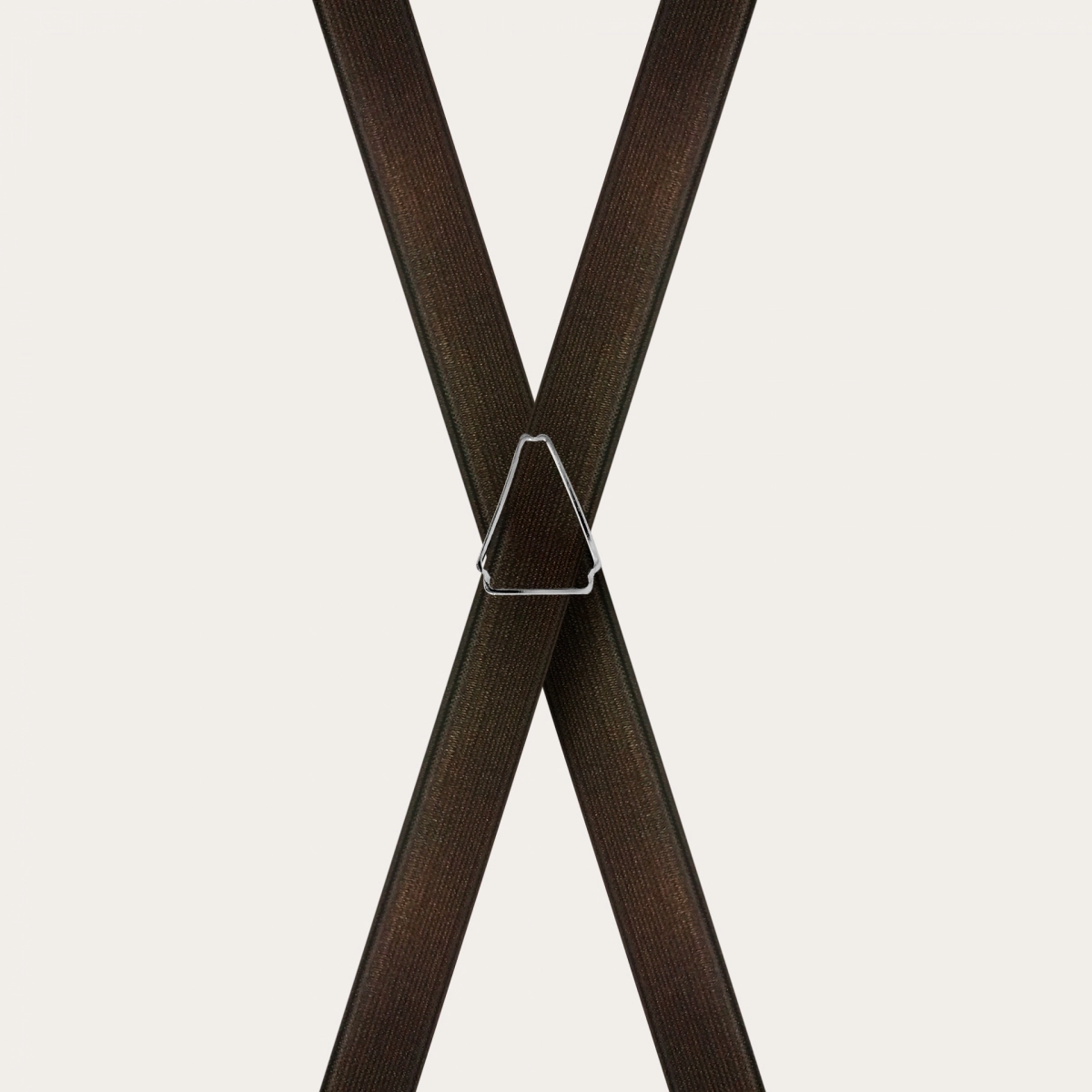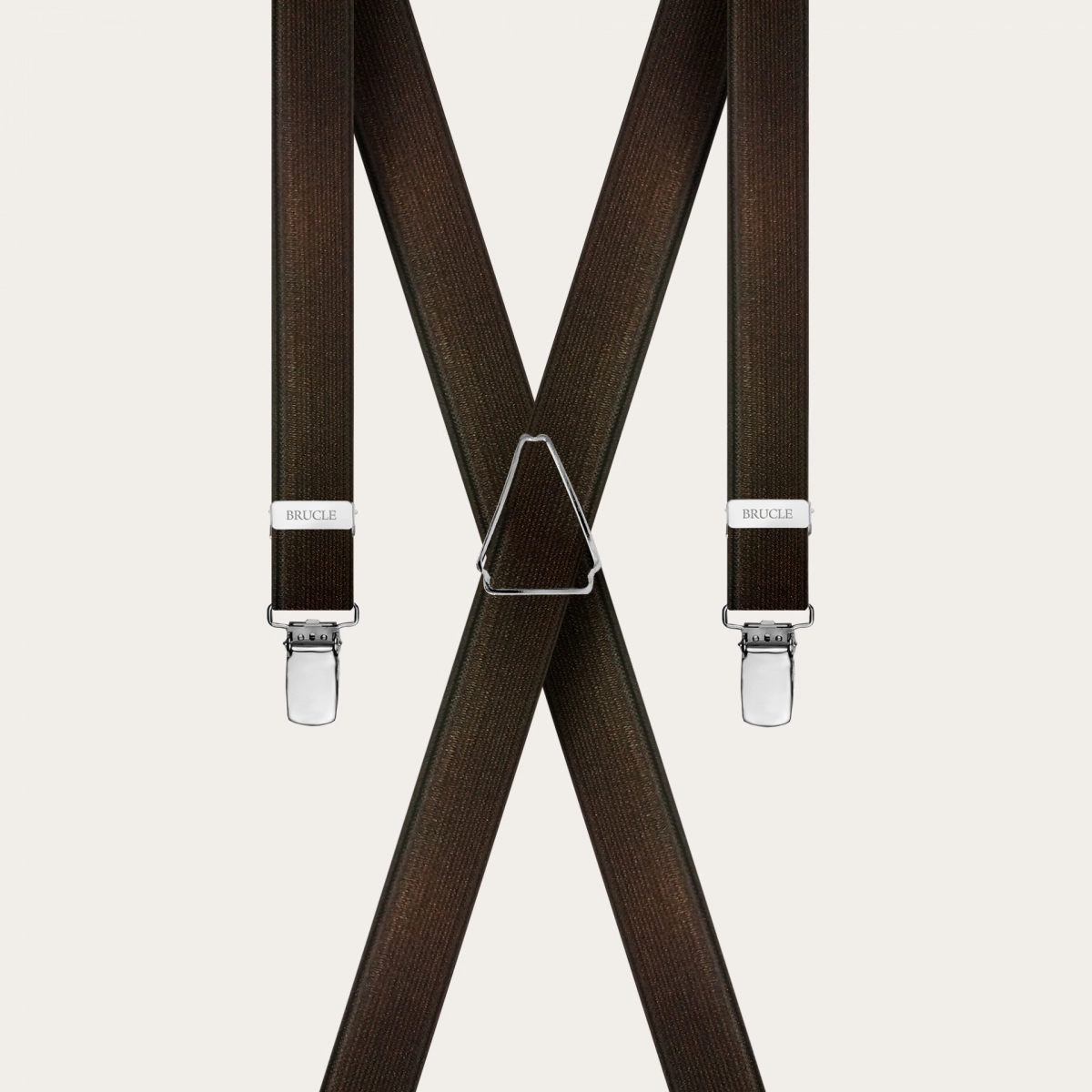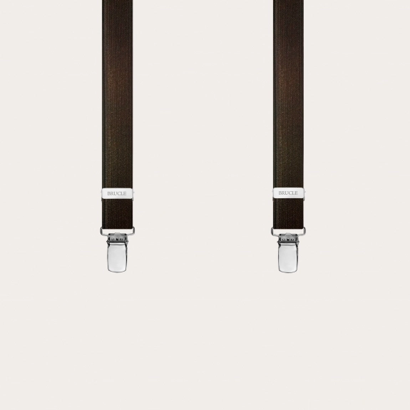 Formal skinny X-shape elastic suspenders with clips, satin brown