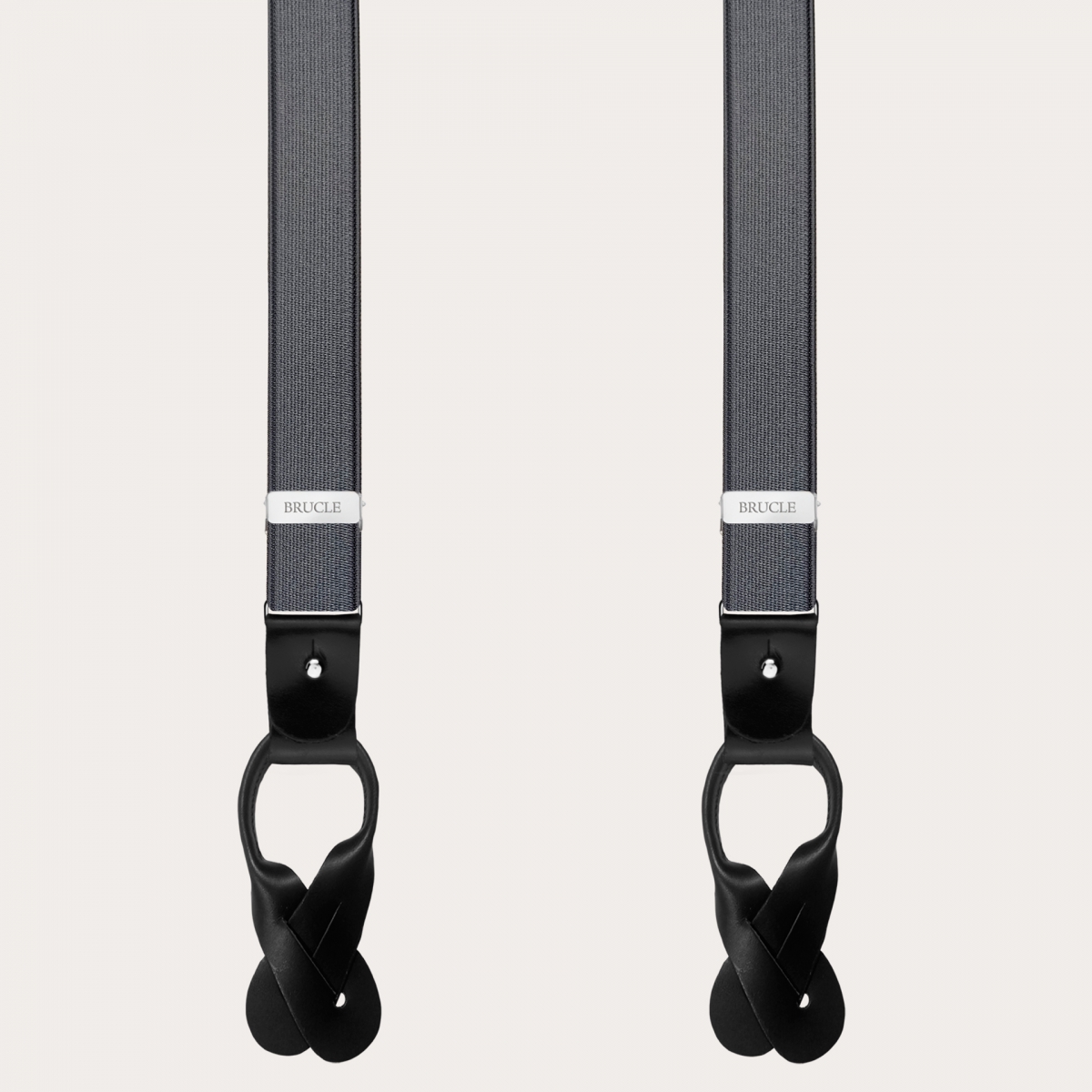 Grey Y-shaped satin braces with mustache print, unisex, with genuine calfskin leather ends branded BRUCLE. Elegant and versatile, perfect for formal wear. Wear with buttons or clips.