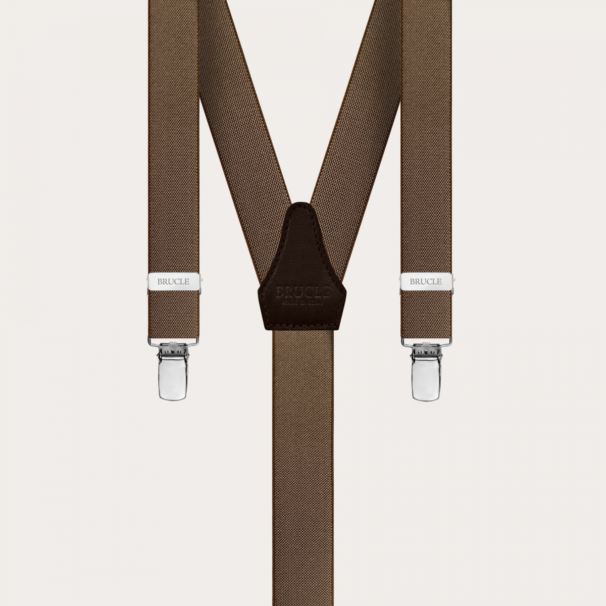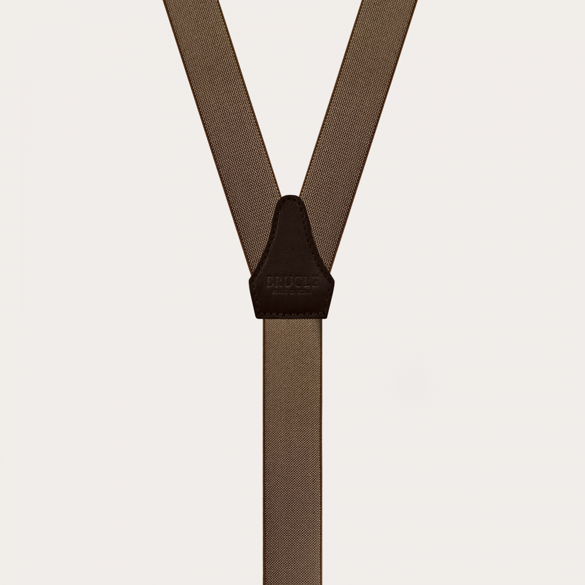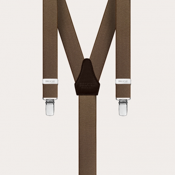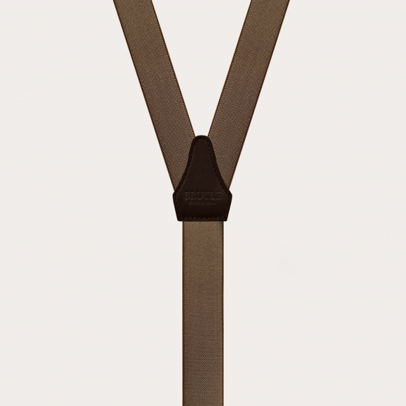 Y-shape elastic suspenders with clips, brown. An ash-like shade of brown for suspenders that want to be elegant in all environments without having to impose themselves on the overall outfit. Entirely handmade in Italy.