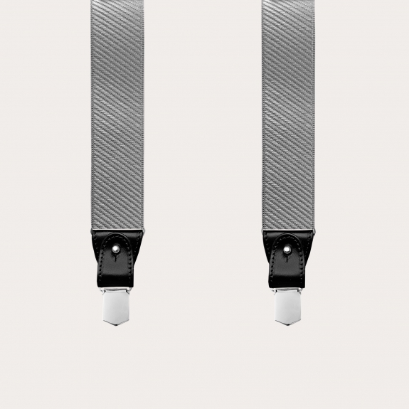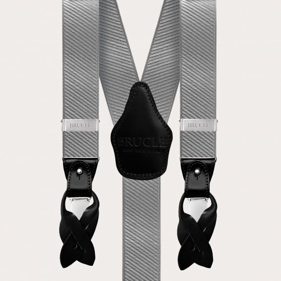 A dual-use model, which can be worn either with clips or with leather buttonholes.