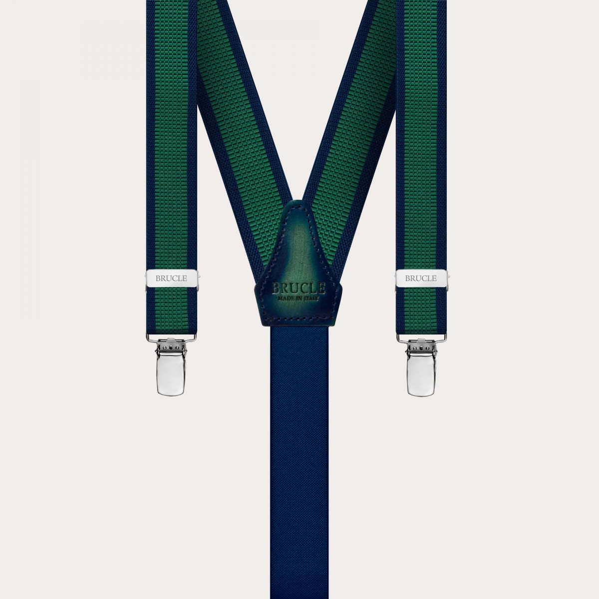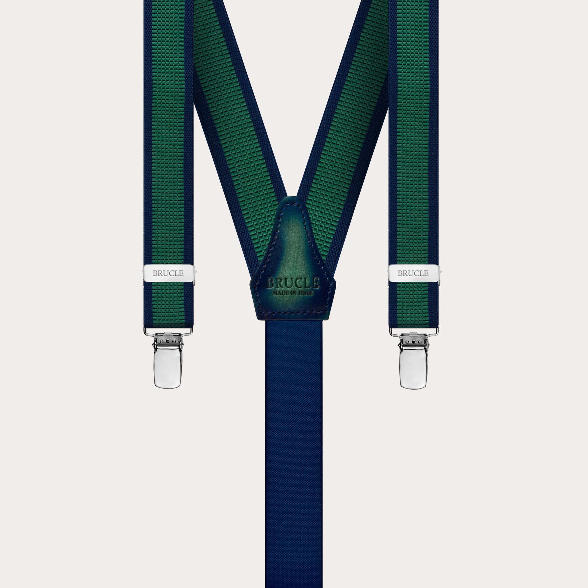 This model of thin nickel free suspenders is characterized by a regimental pattern with an almost three-dimensional look, the colors of which are reprised in the hand-colored and hand-shaded green and blue leather backpatch.