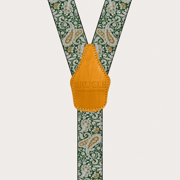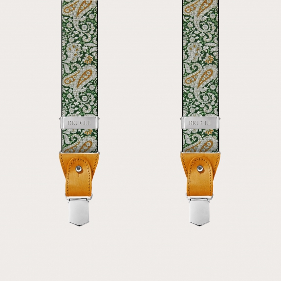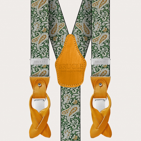 Sunny and elegant model of double use suspenders with paisley pattern in shades of green and gold.