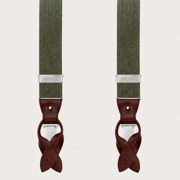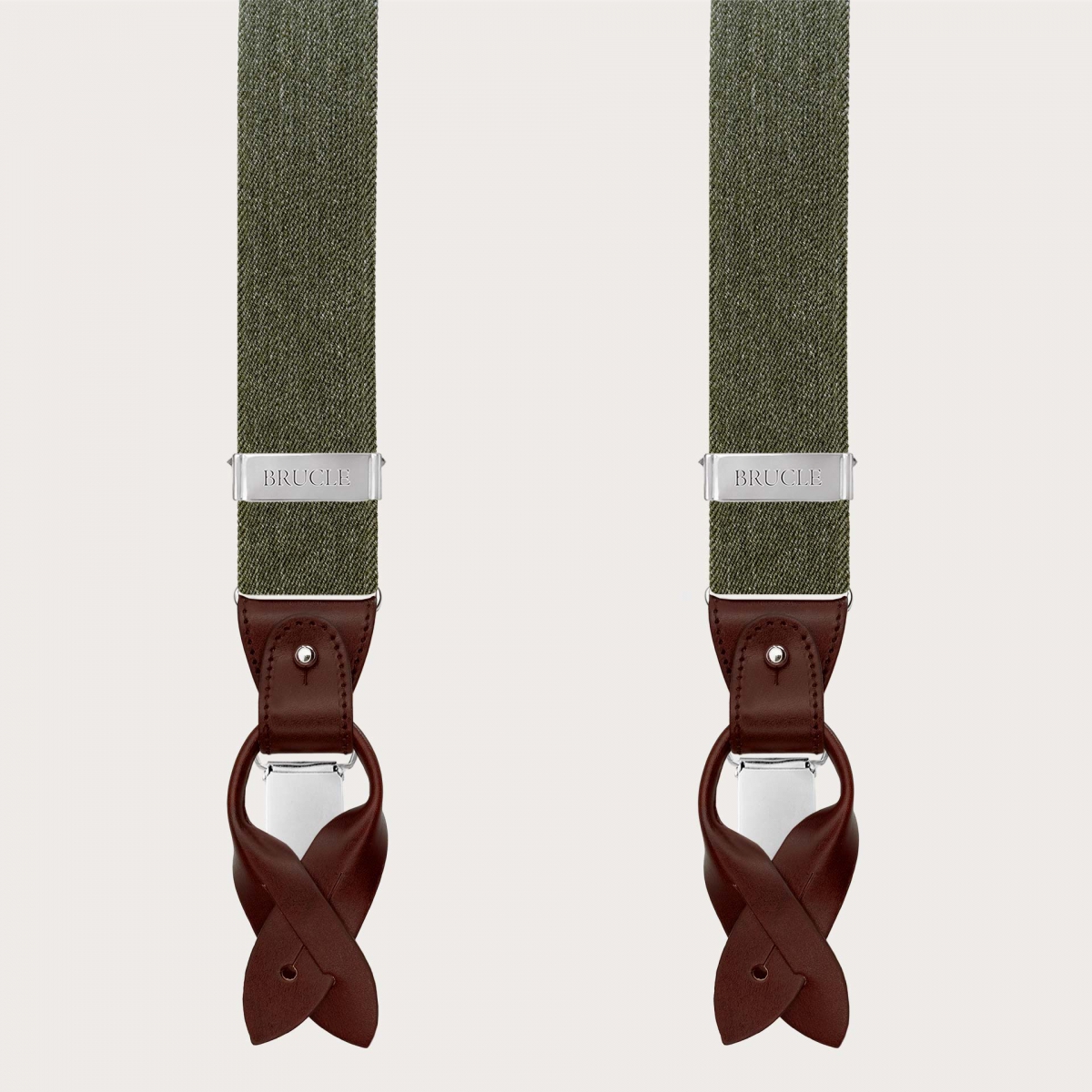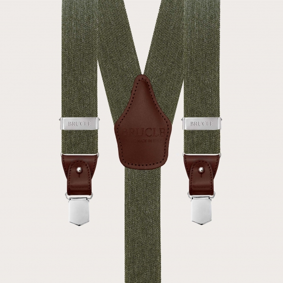 Elastic suspenders with green-colored jeans effect tape. Thanks to their Y-shape with dual use, they can be worn with buttons or clips, for a more refined or practical style.