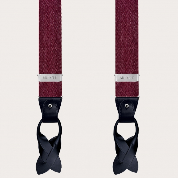 Bordeaux suspenders in bordeaux elastic with a jeans effect finished with black leather parts, creating an elegant contrast.