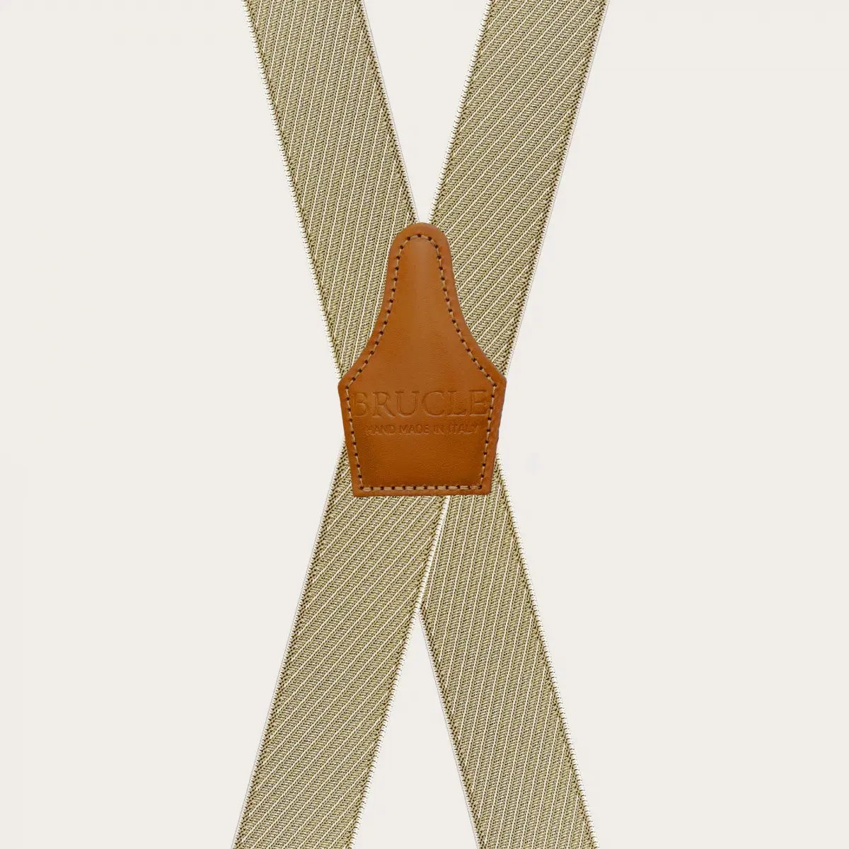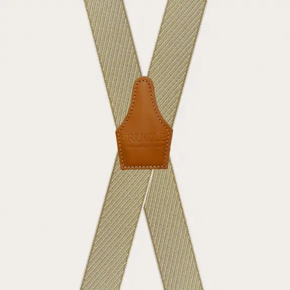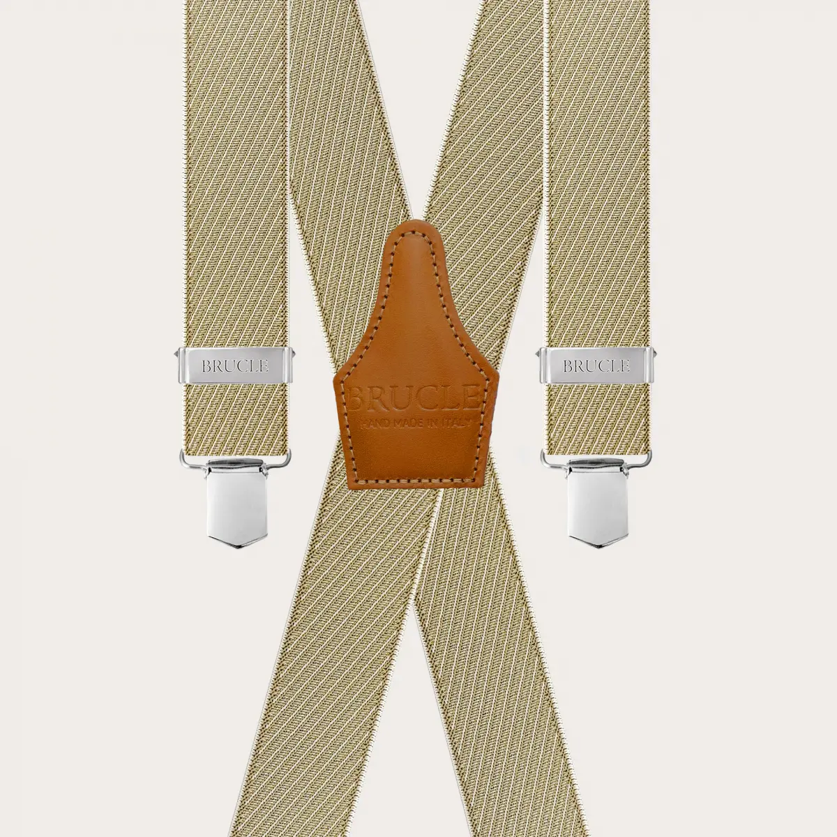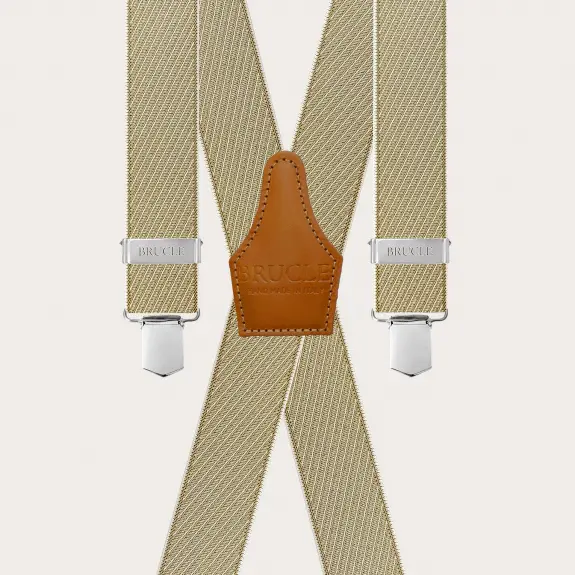 Men's beige and gold striped suspenders with two back legs and an X shape, for exclusive use with clips.