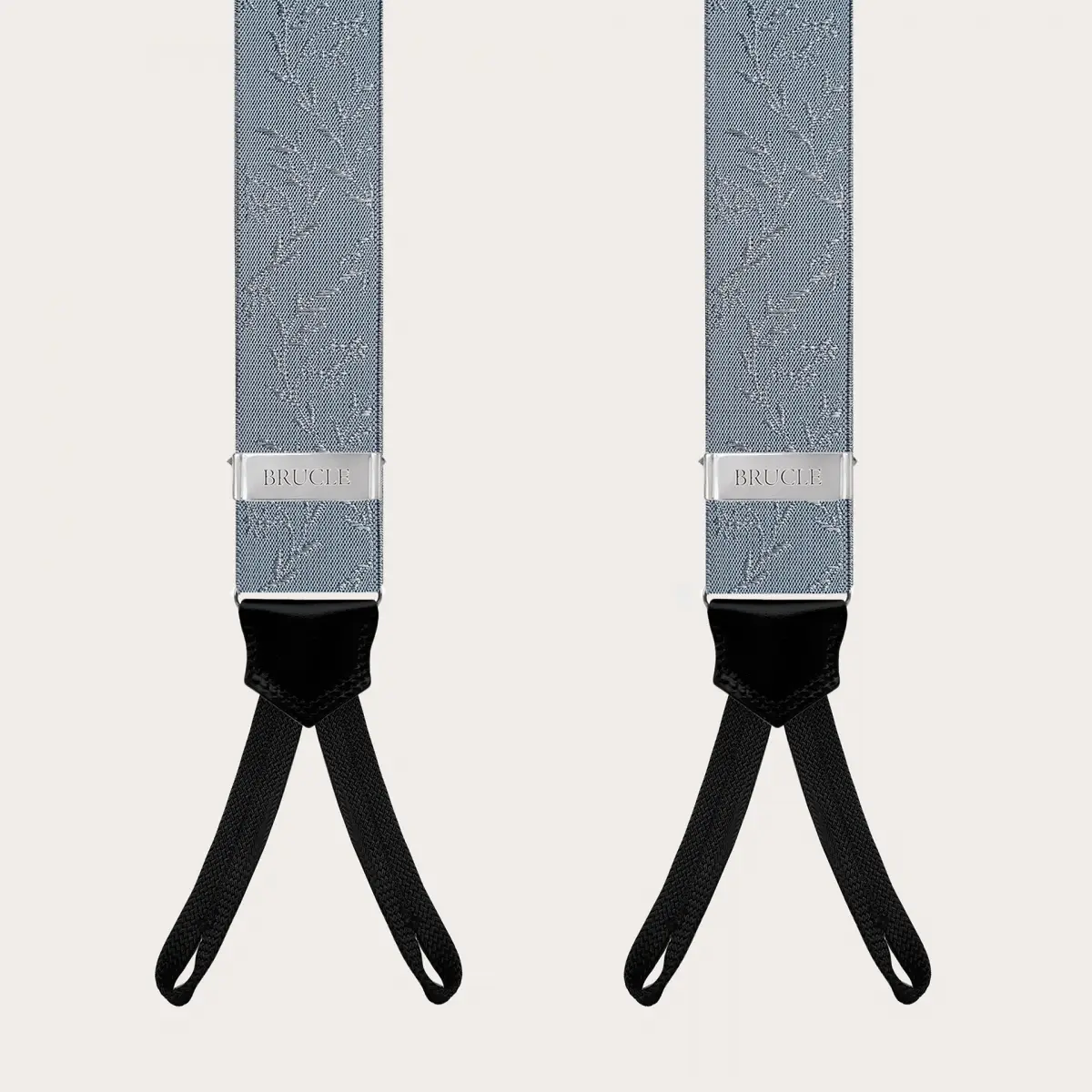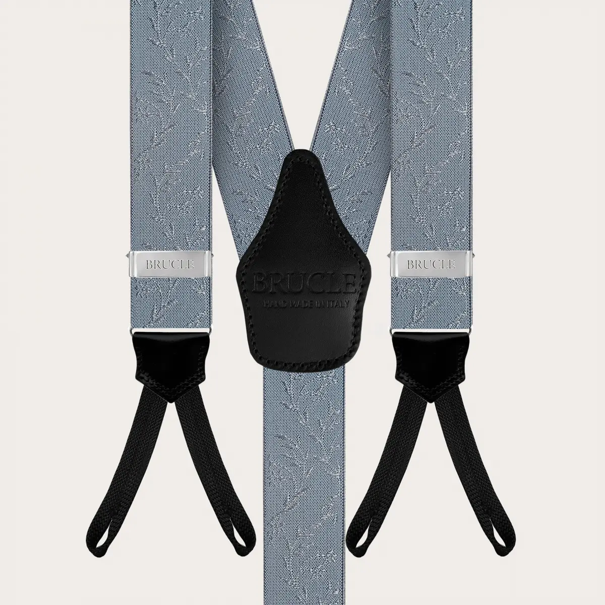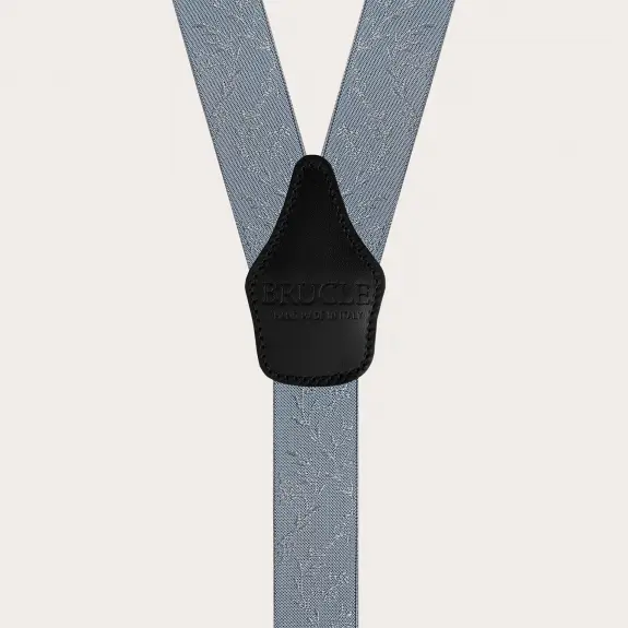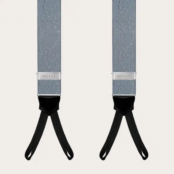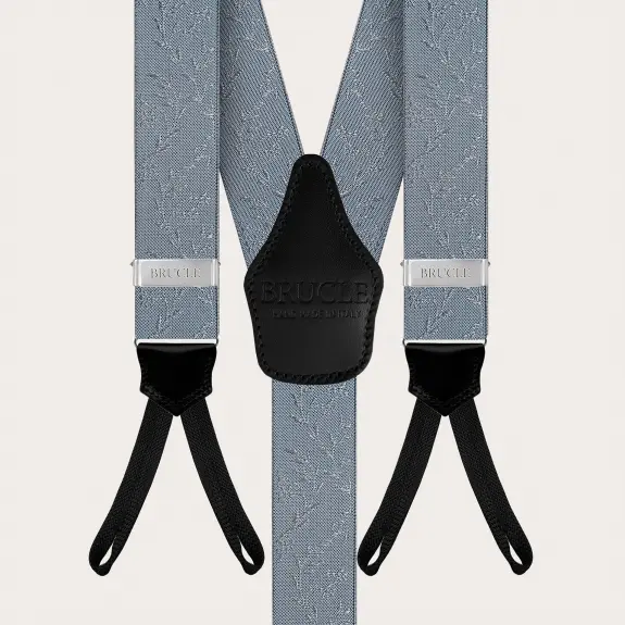 Elegant suspenders for ceremonies in a refined powder blue color embellished with a pearl-colored floral pattern. An elegant and refined model, to be worn exclusively with buttons. Customizable with engravings, they are entirely handmade in Italy with the finest materials. Discover also the coordinated silk accessories for a unique total look.