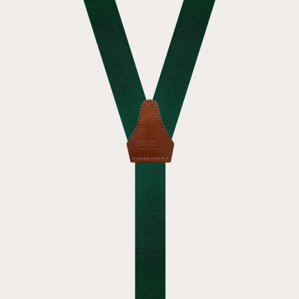 Discover the fascinating world of green Brucle suspenders made in Italy, an accessory that combines sophisticated style and bold personality. These artisan suspenders, crafted with passion and skill by skilled Italian craftsmen, embody the excellence and high quality that characterize made in Italy.The green Brucle suspenders are a symbol of refinement and attention to detail, ideal for those who want to stand out and add a touch of color to their wardrobe. The vibrant green shade infuses energy and vitality, enhancing your style and adding an unmistakable element of charm, enriched by the contrast with the dark brown leather parts and the nickel-free silver metal parts.