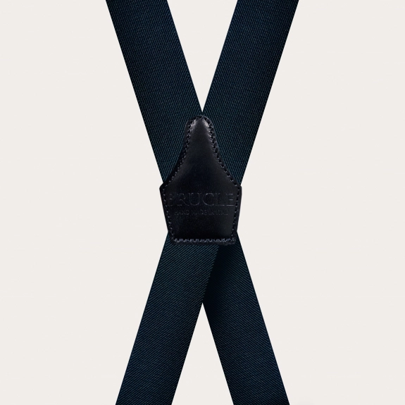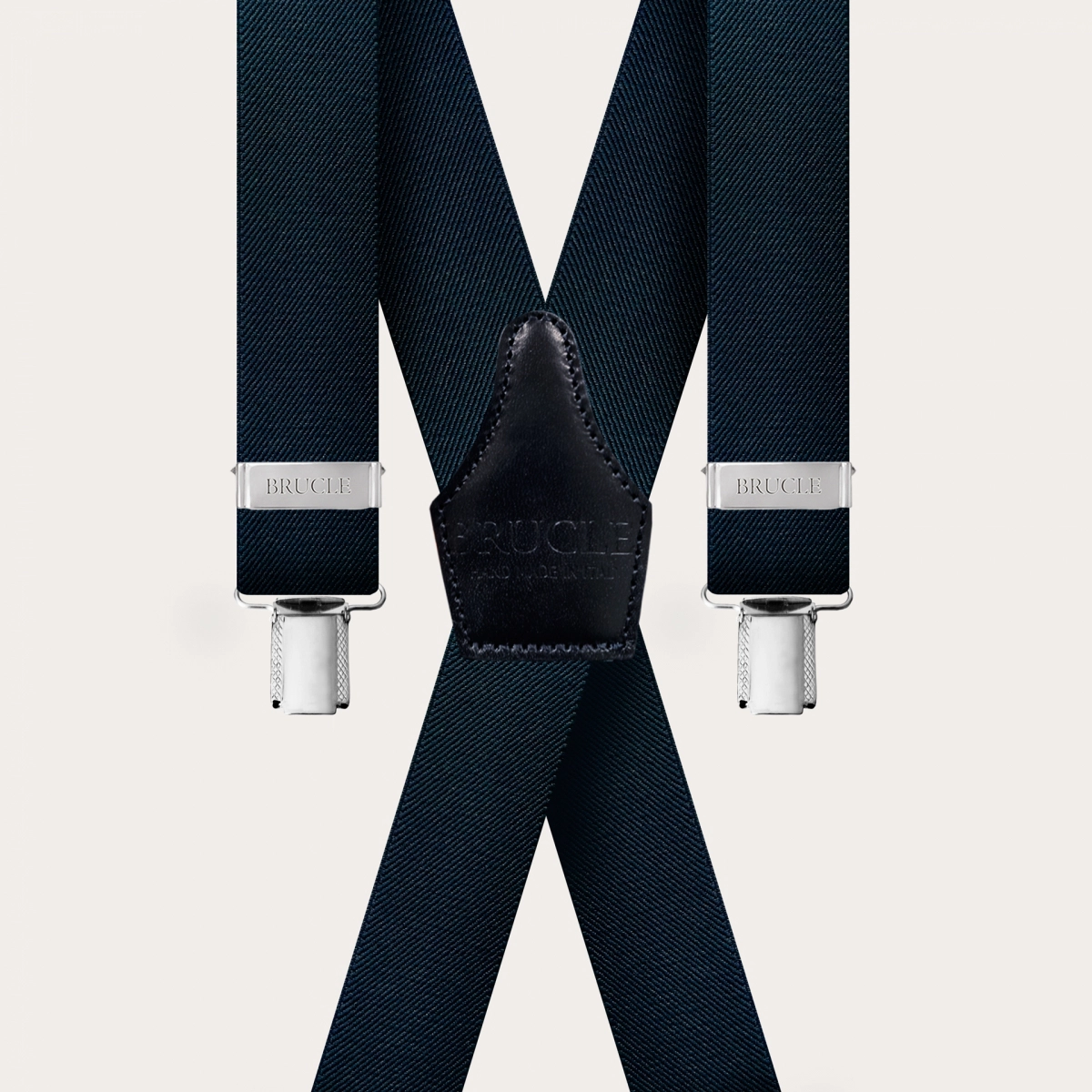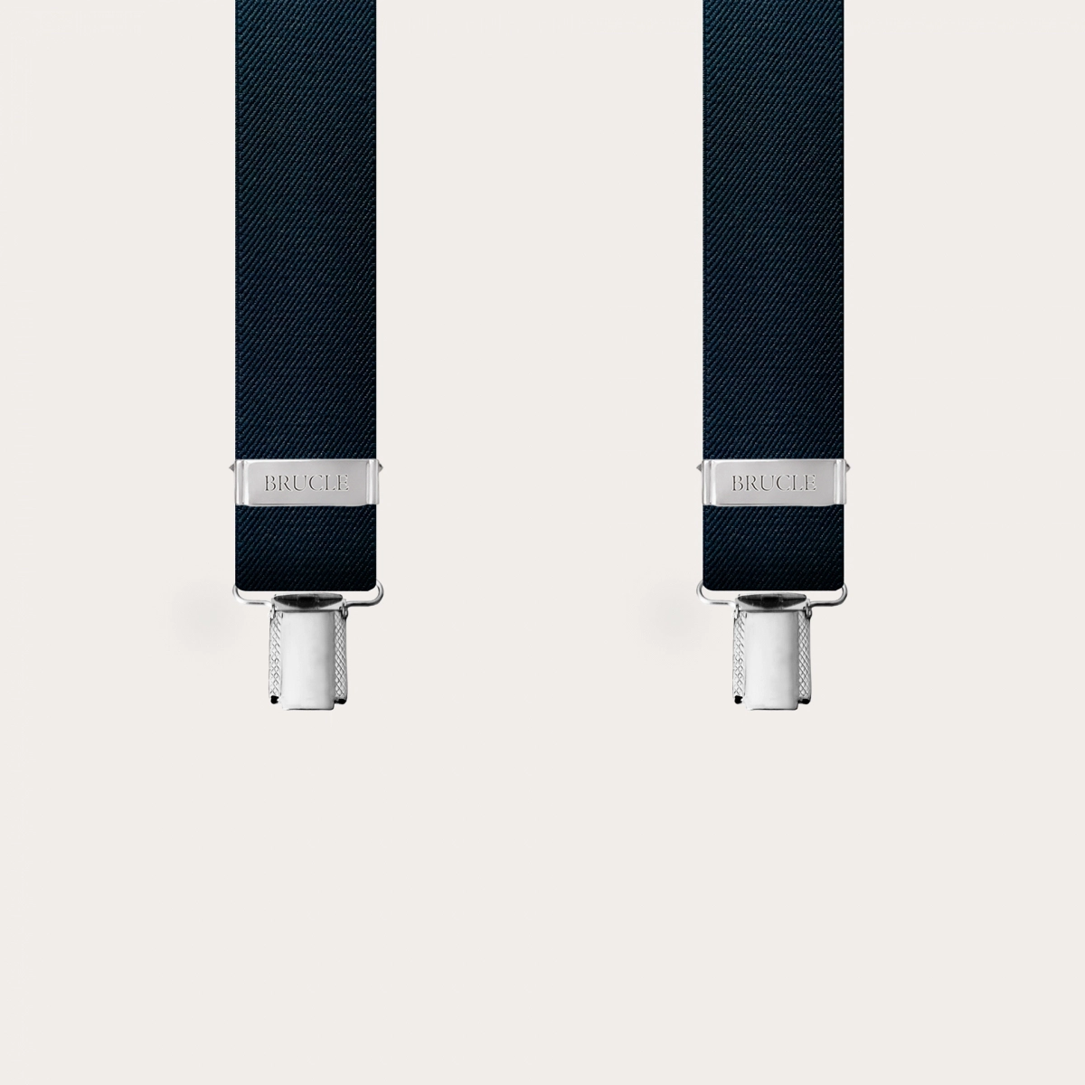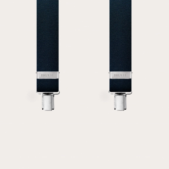 X-shape elastic suspenders with clips, blue navy. Elegant and comfortable elastic suspenders, entirely handmade in Italy.