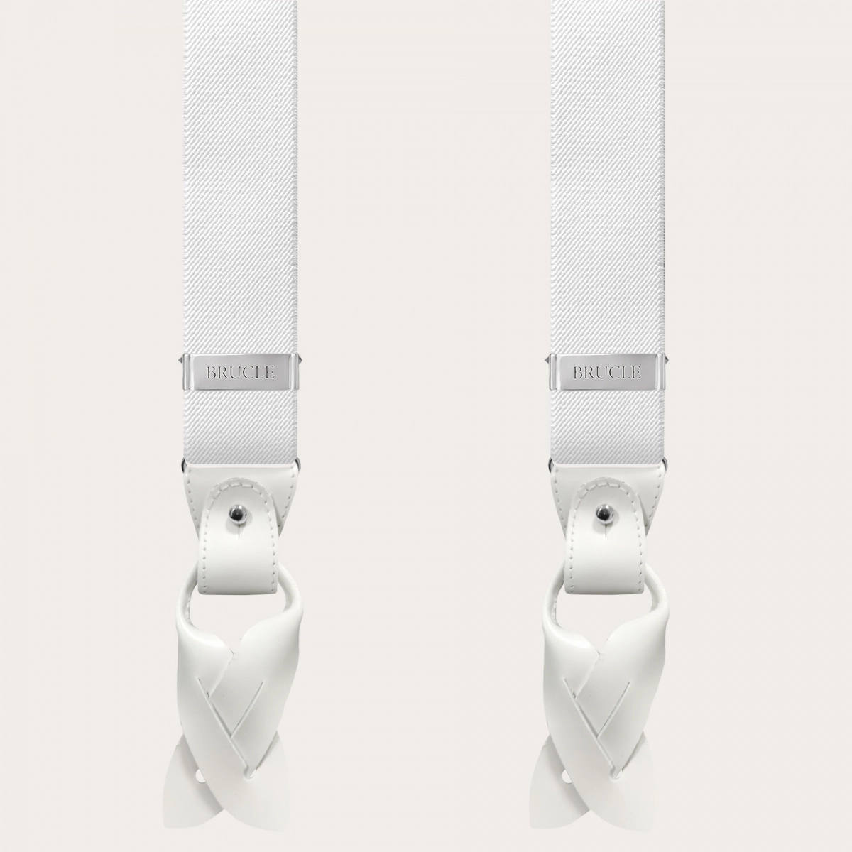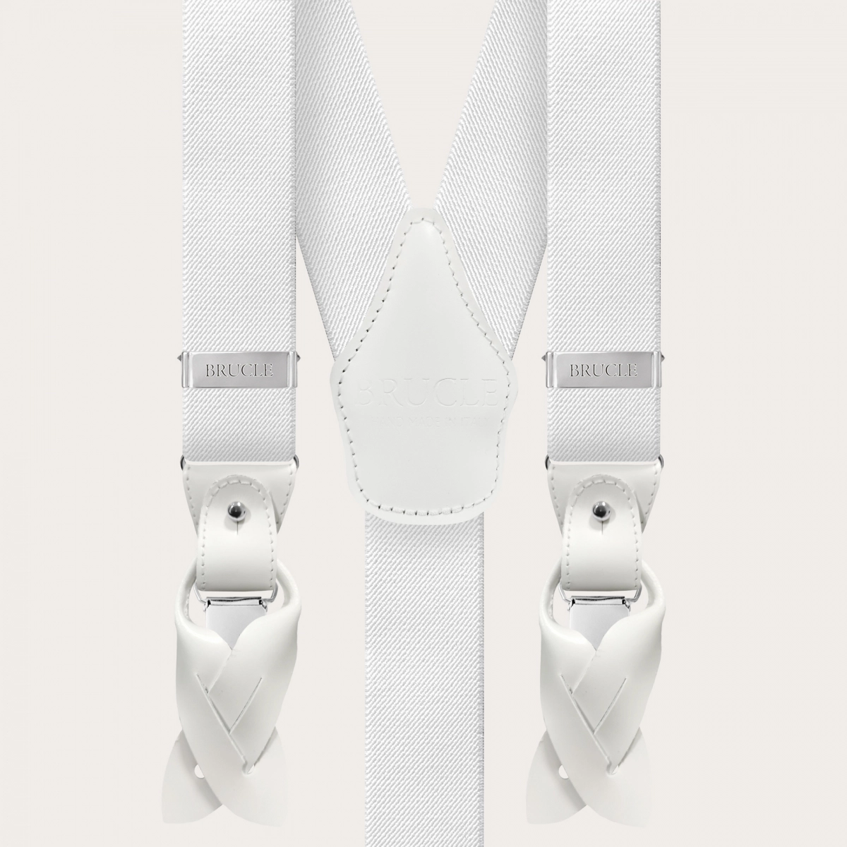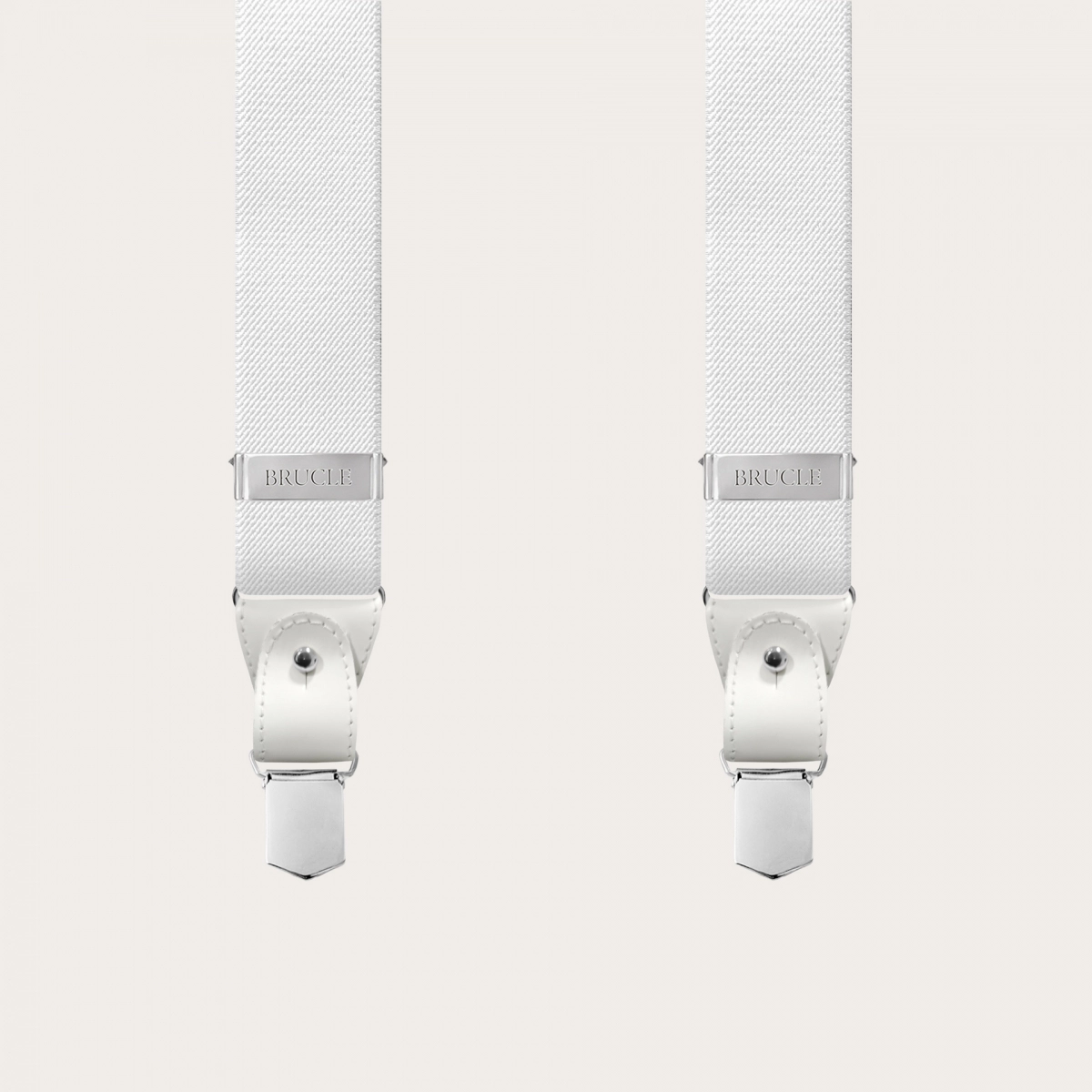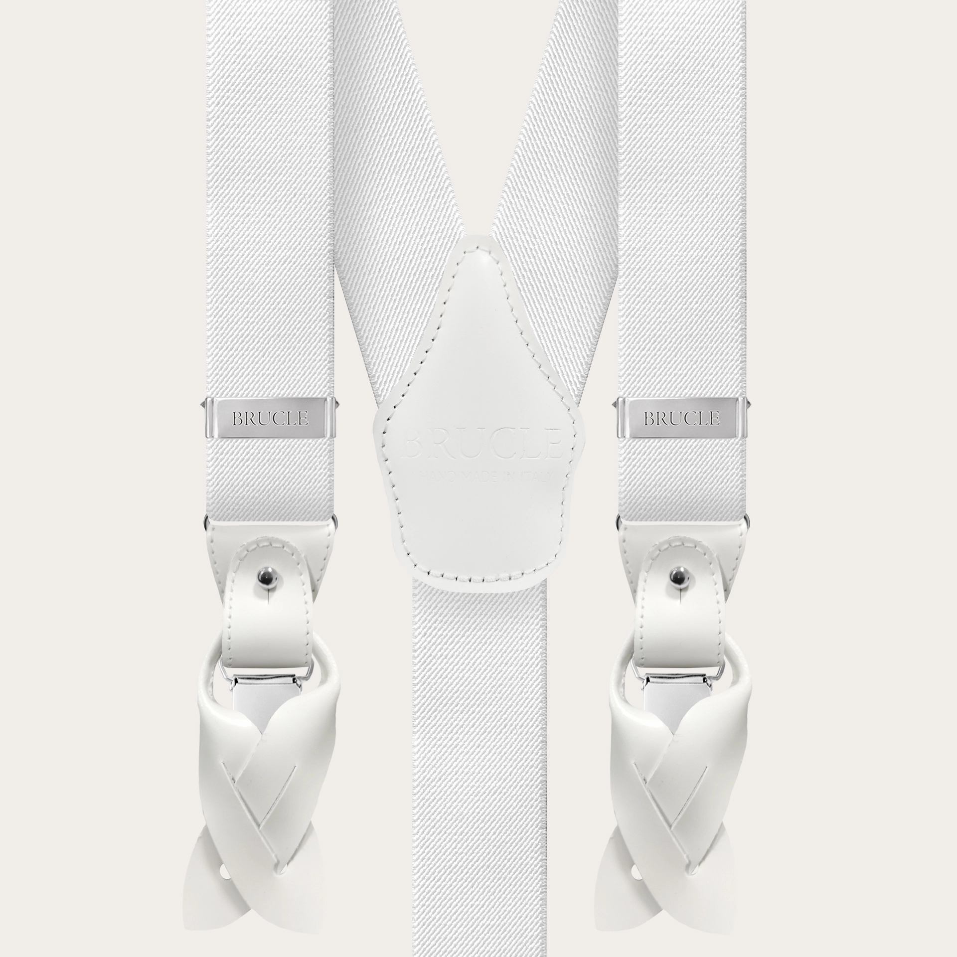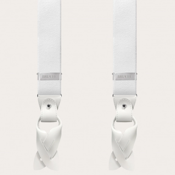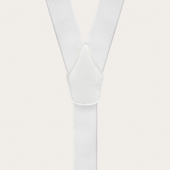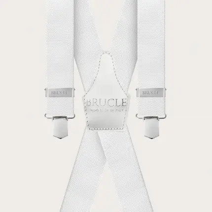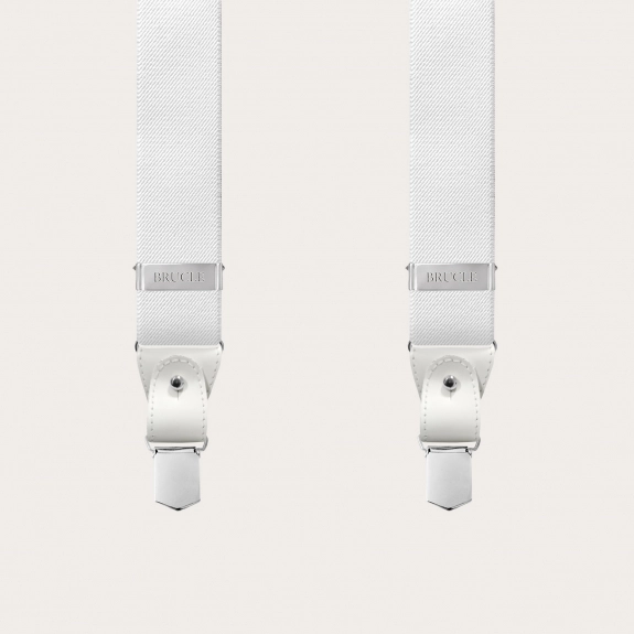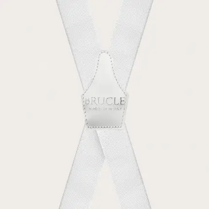 Elegant nickel free dual use white suspenders. An elegant and timeless model that does not renounce the comfort of elastic suspenders.