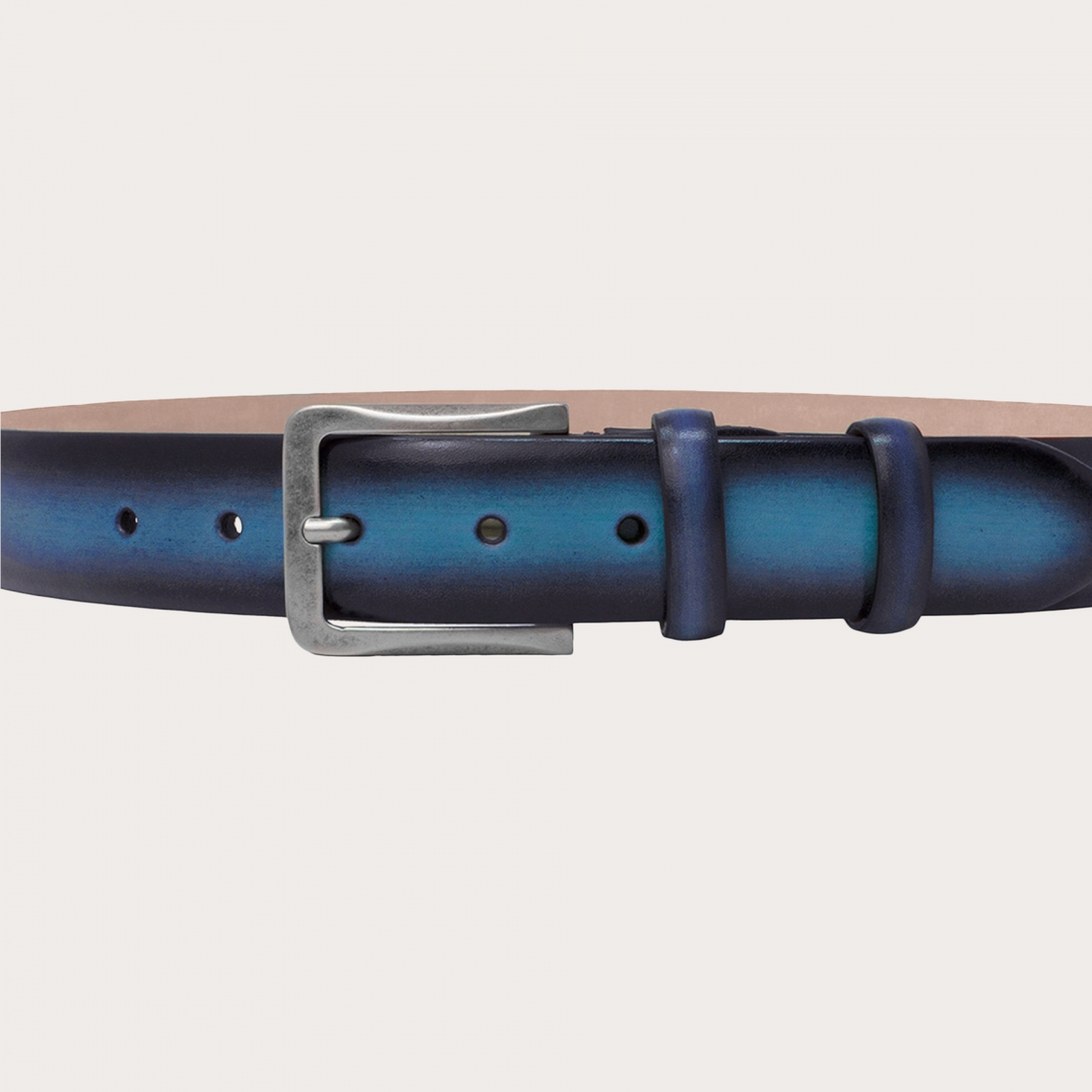 Original hand-colored and shaded men's belt in genuine leather, faded black to blue. A unique model, finished with a retro-designed vintage effect buckle, hand-stitched. Customizable with engravings on the buckle and tip.