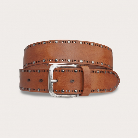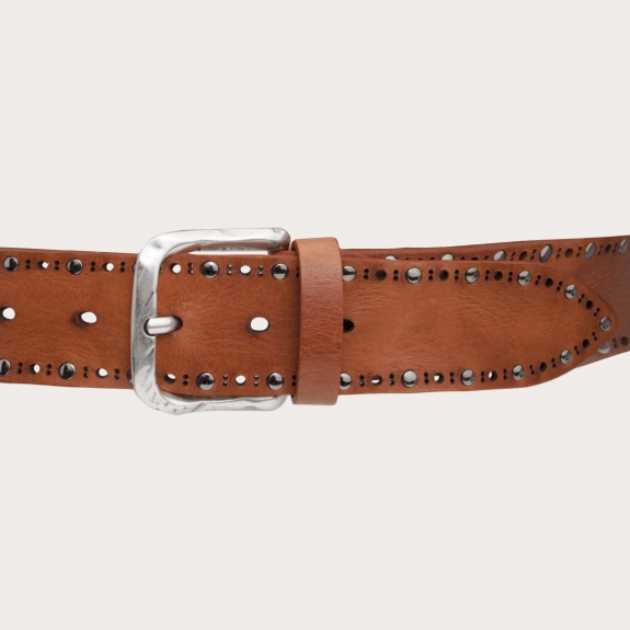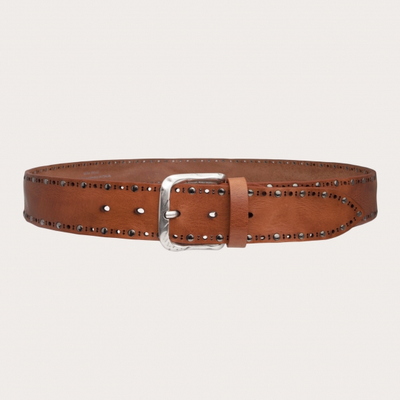 Casual belt in genuine leather with a refined distressed effect, enhanced by a double buckle with an antique bronze finish. The leather color with natural veining gives it a unique and authentic charm.