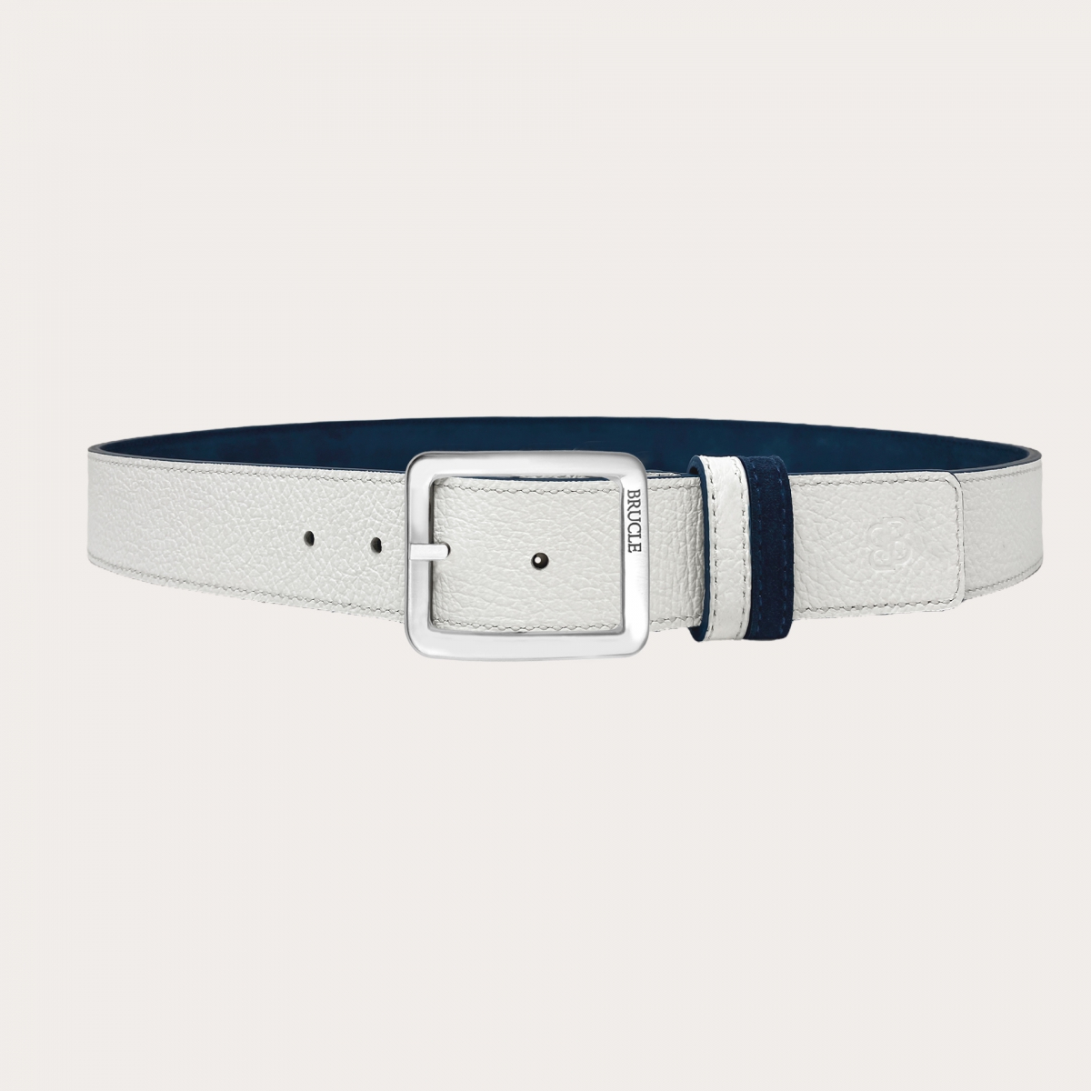 Reversible double face belt with blue suede on one side and white tumbled calfskin on the other. With double nickel free buckle, available in different finishes: silver, gold and ruthenium. The flat model with square tip makes it a modern and trendy model, the colors make it suitable for every season.