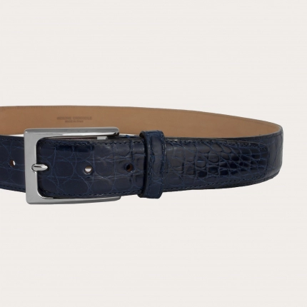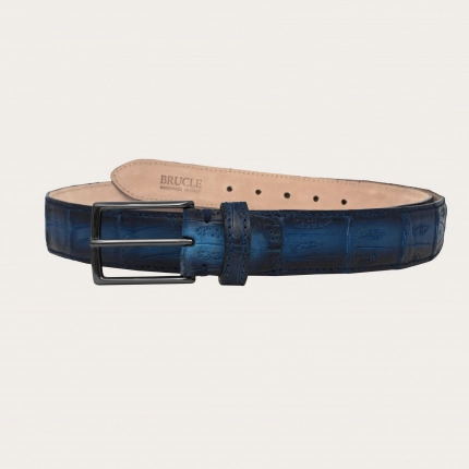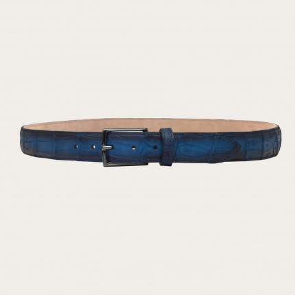 Luxury belt in alligator or crocodile leather with nickel-free buckle, blue shaded with black