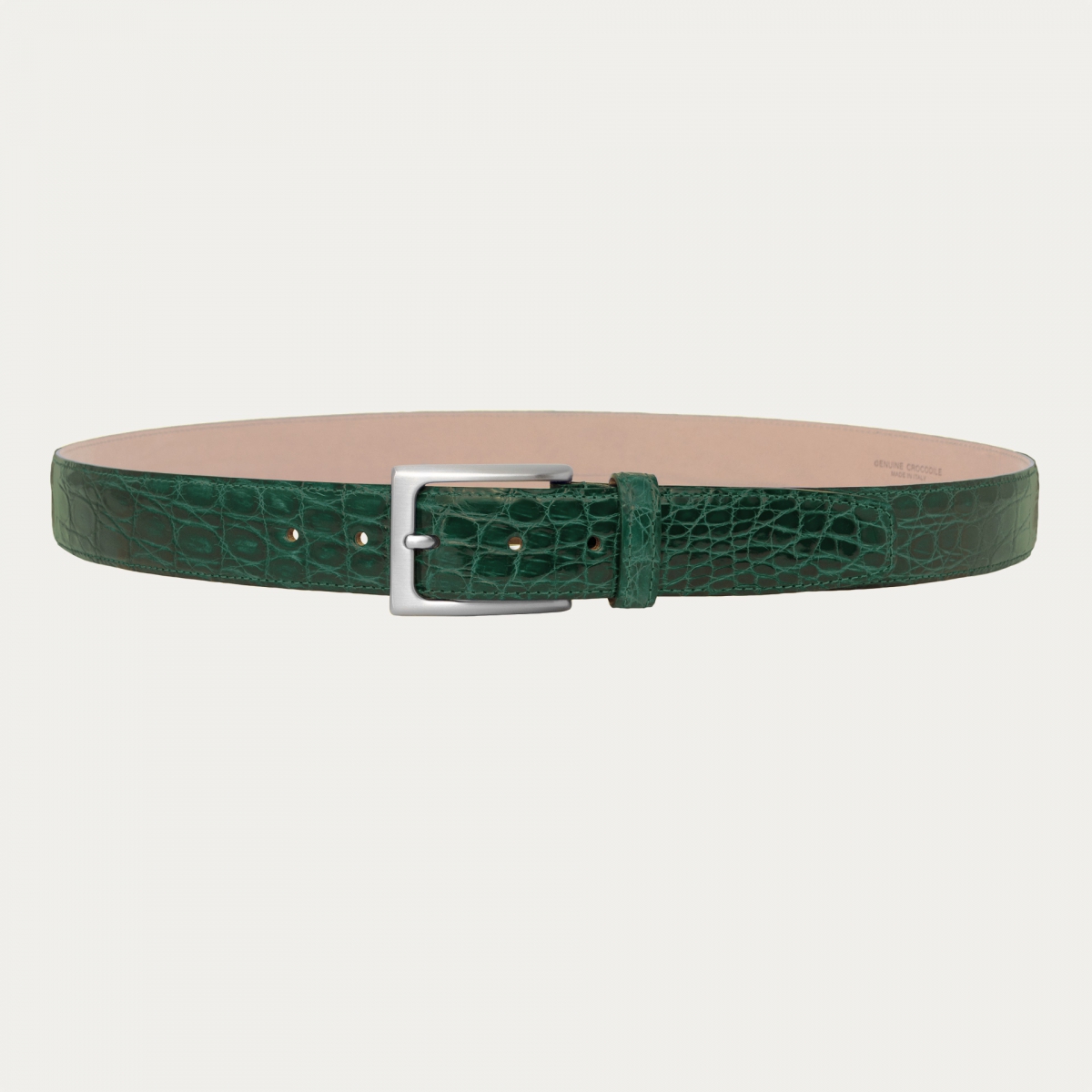 The deep shade of green enhances and highlights the natural beauty of the genuine exotic crocodile leather.