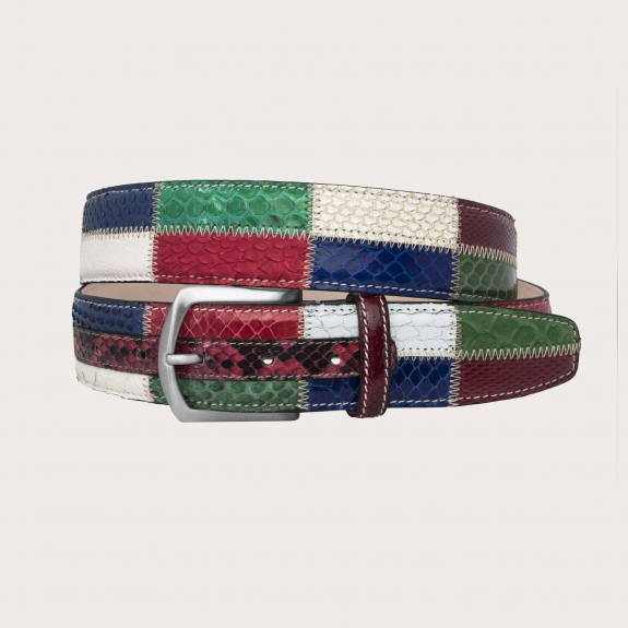 The python belt with patchwork design by Brucle is a true gem of craftsmanship and exclusive design. Handmade in Italy, this belt is a striking combination of colors and textures that creates a one-of-a-kind multicolor effect.