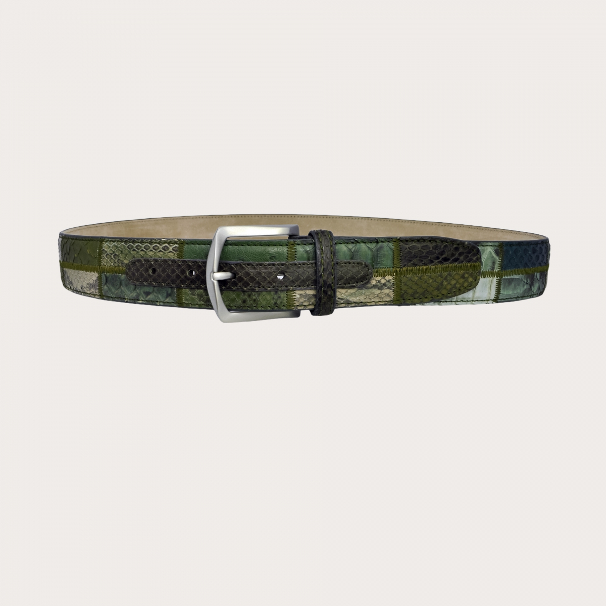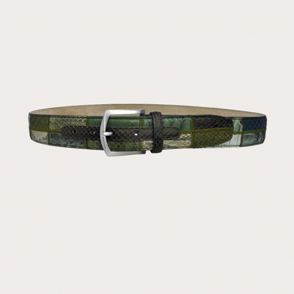 Genuine python belt from the BRUCLE patchwork belt collection. The different shades of green combine with beige and rock for a surprising effect. Each belt is a unique piece, different from the others.