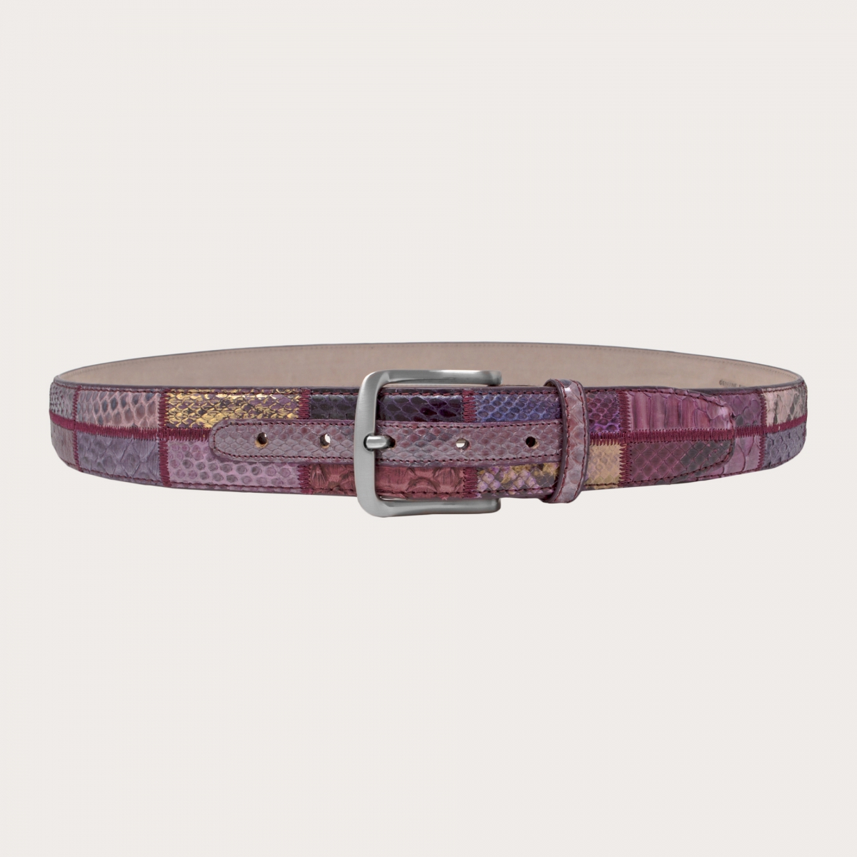 Genuine python leather belt, purple patchwork. 100% masterfully handcrafted and handsewn in Italy. Because of the use of genuine leather for each part of the accessory, every belt is a one-of-a-kind piece.