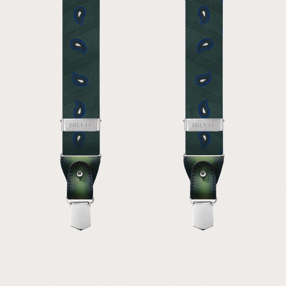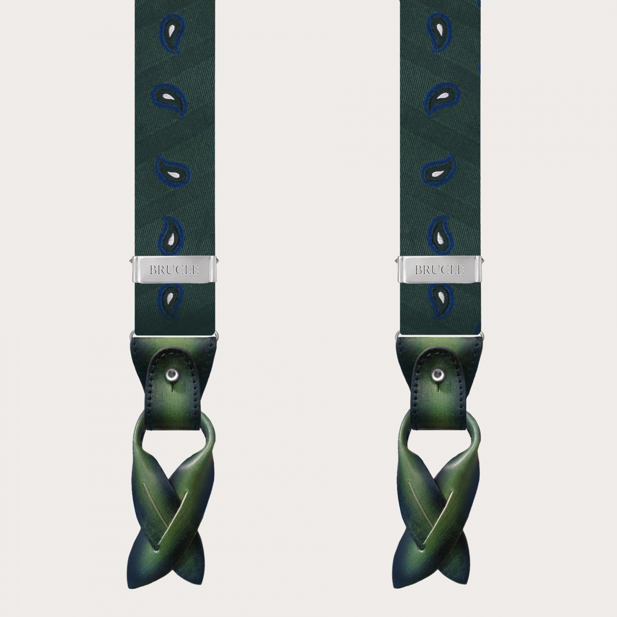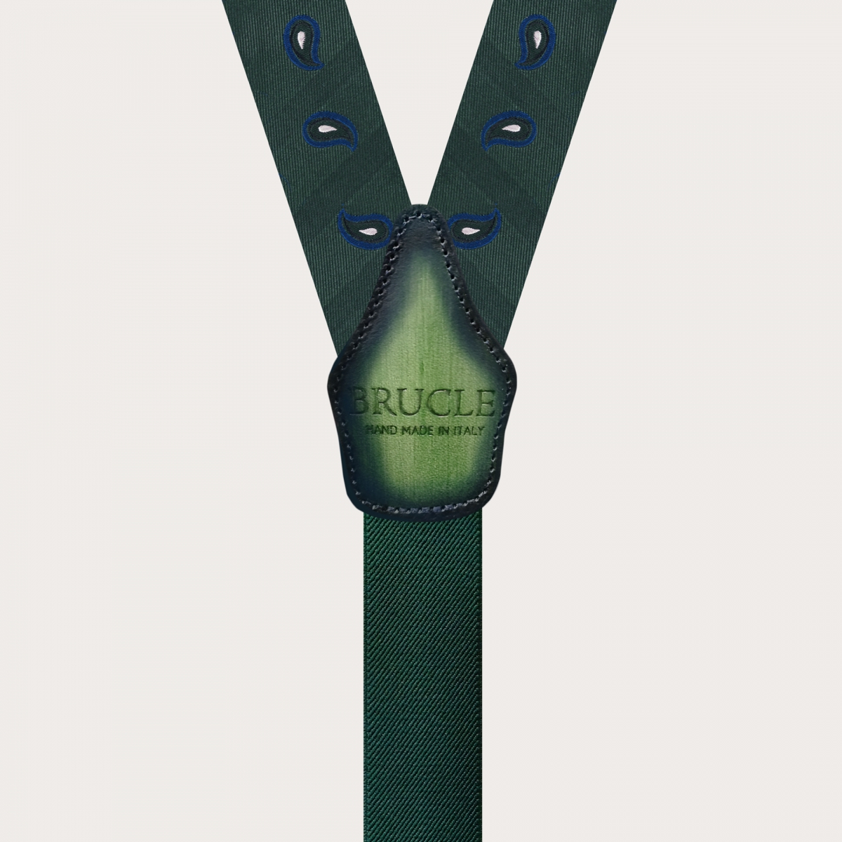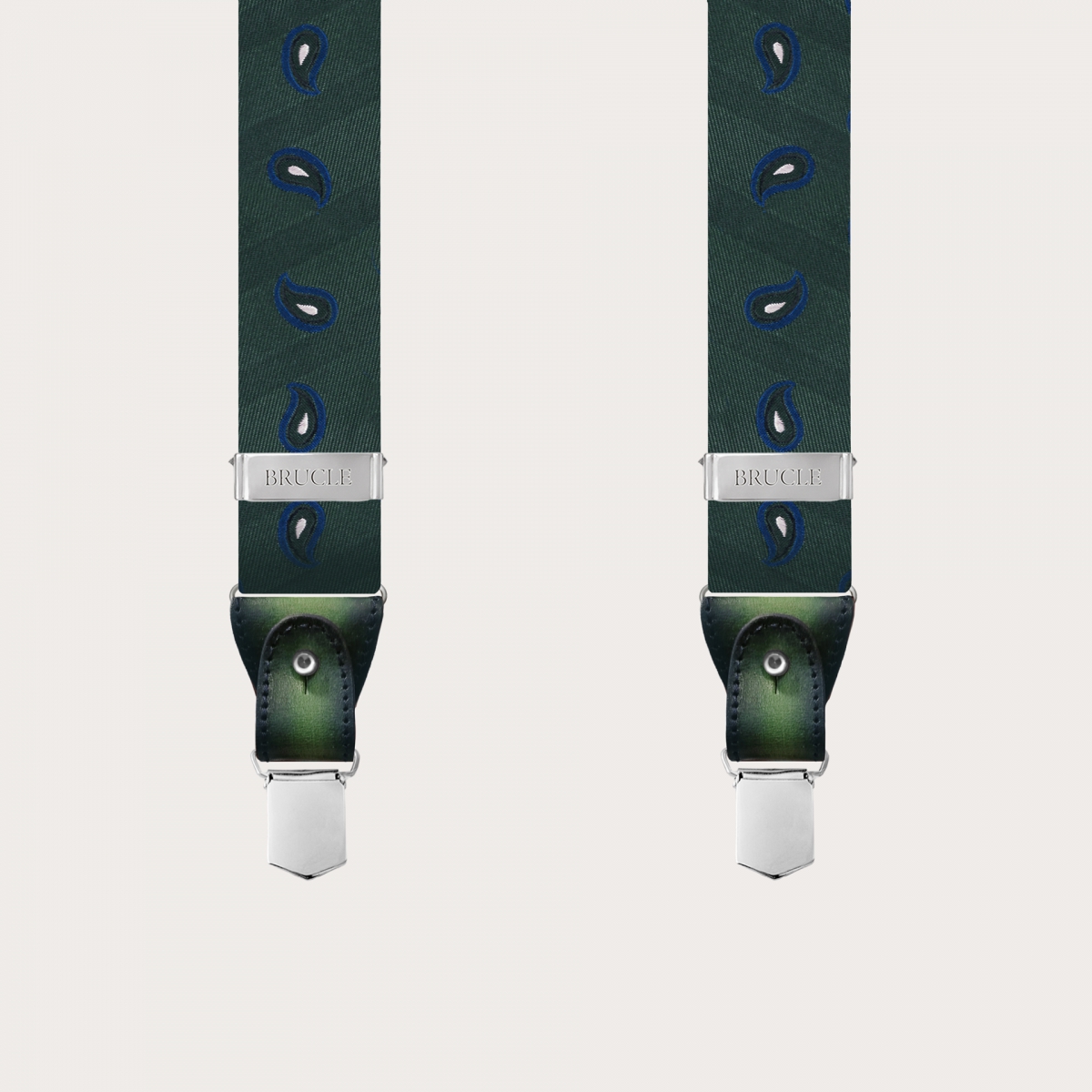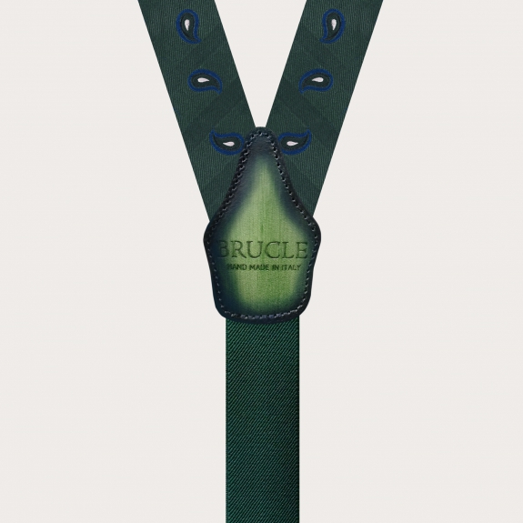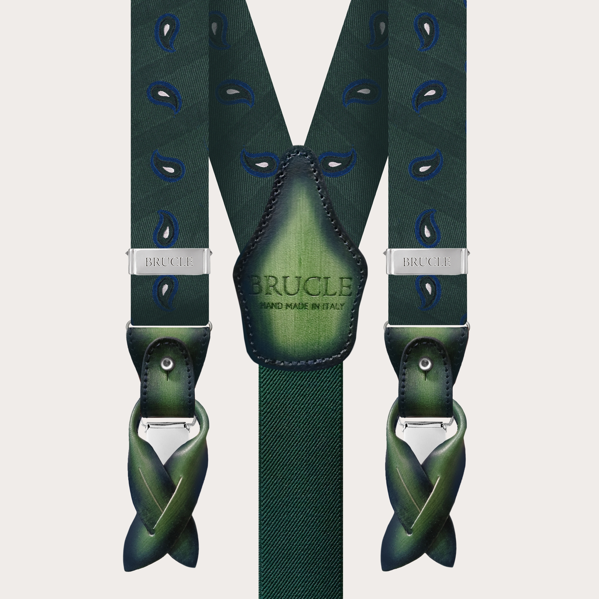 Men's silk suspenders in green paisley Brucle: Made in Italy elegance. These silk suspenders are made with high-quality materials that stand the test of time.