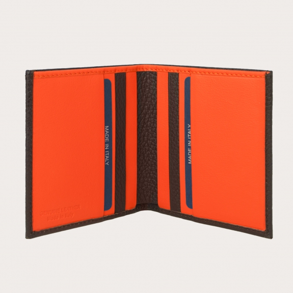Compact mini wallet in saffiano leather with money clip and coin purse, brown and orange