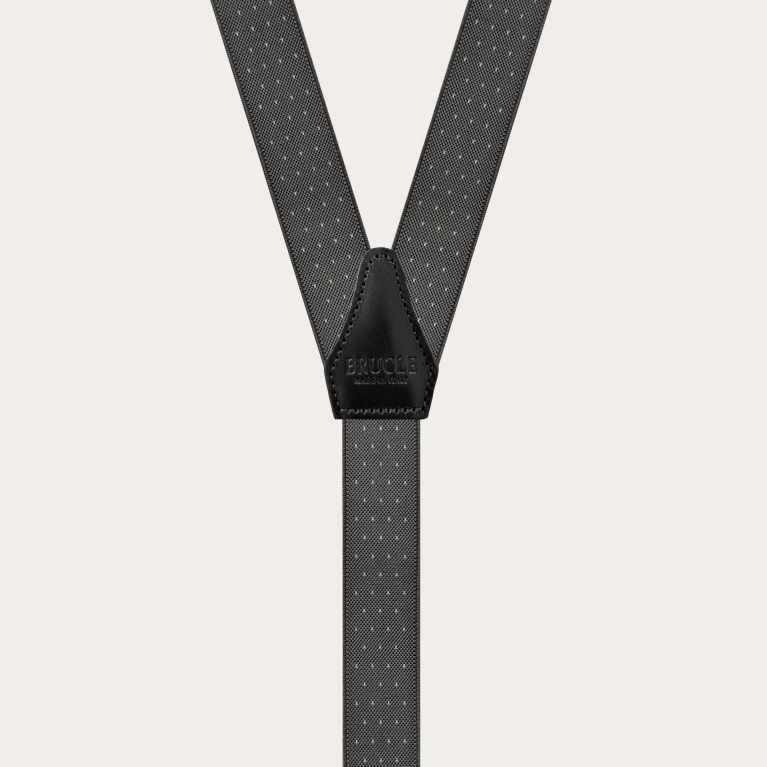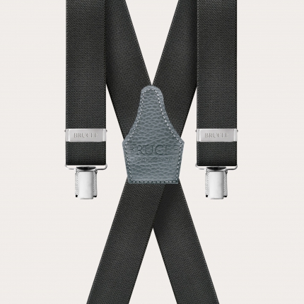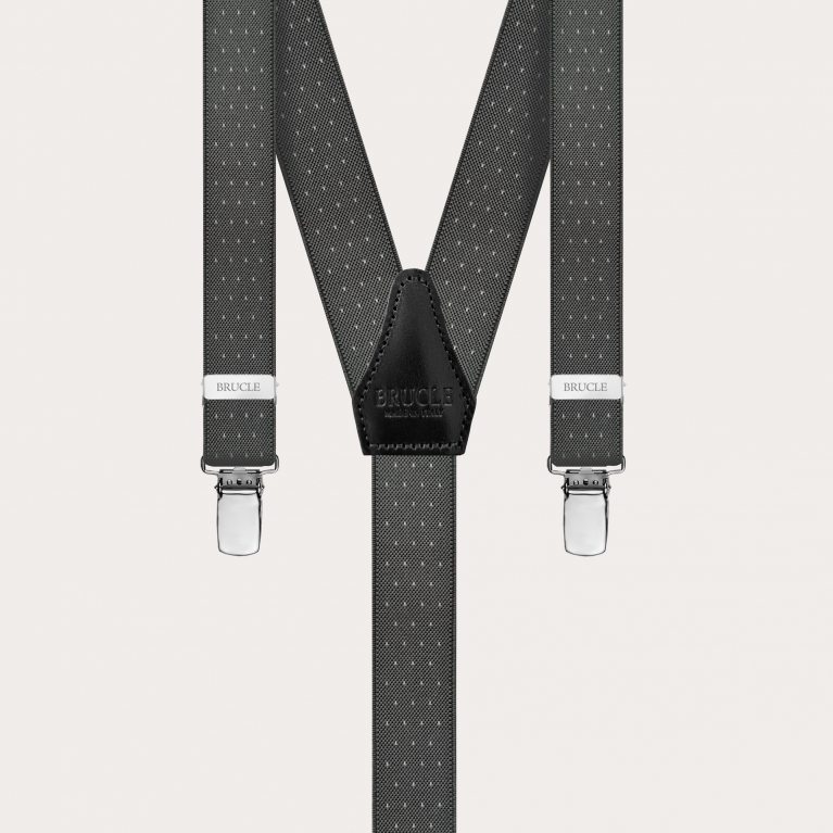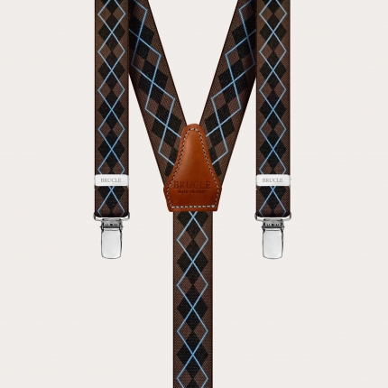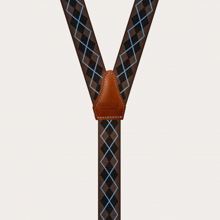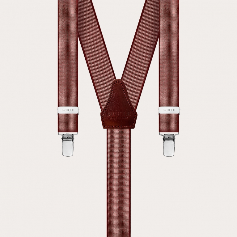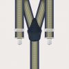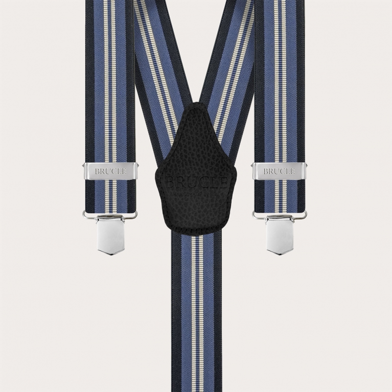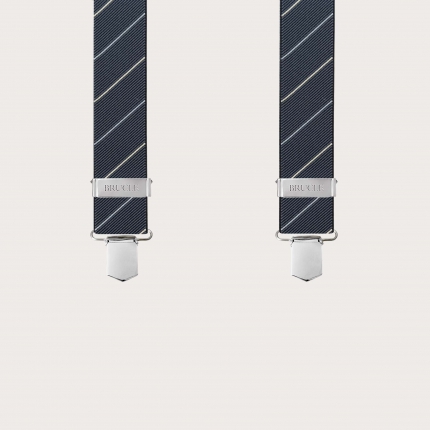 X-shape elastic suspenders with clips, dark blue regimental. Elegant and comfortable elastic suspenders, entirely handmade in Italy in a classic and elegant pattern for formal and casual outfits alike.
