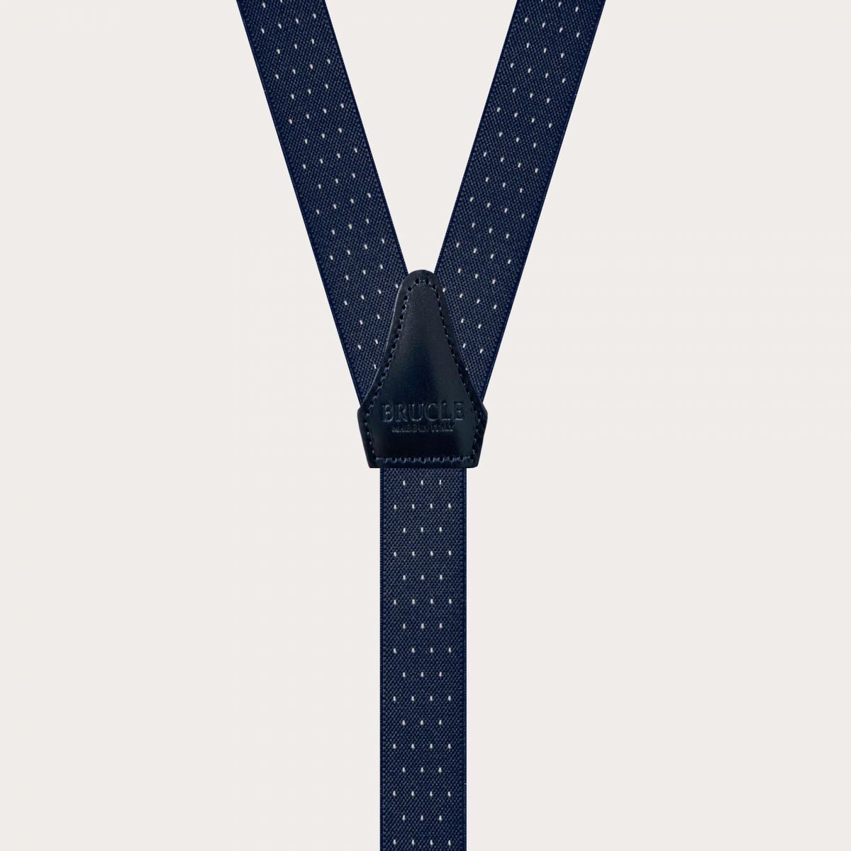 Y-shape elastic suspenders, white dotted blue. When solid colors are not enough, a dotted pattern can enrich a pair of suspenders without altering their elegance. Entirely handmade in Italy, this accessory is ideal for ceremonies as well as for general formal wear, work environments and even informal every day outfits.