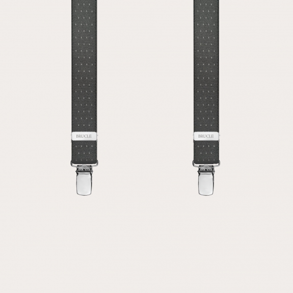 Y-shape elastic suspenders, white dotted grey. When solid colors are not enough, a dotted pattern can enrich a pair of suspenders without altering their elegance. Entirely handmade in Italy, this accessory is ideal for ceremonies as well as for general formal wear, work environments and even informal every day outfits.