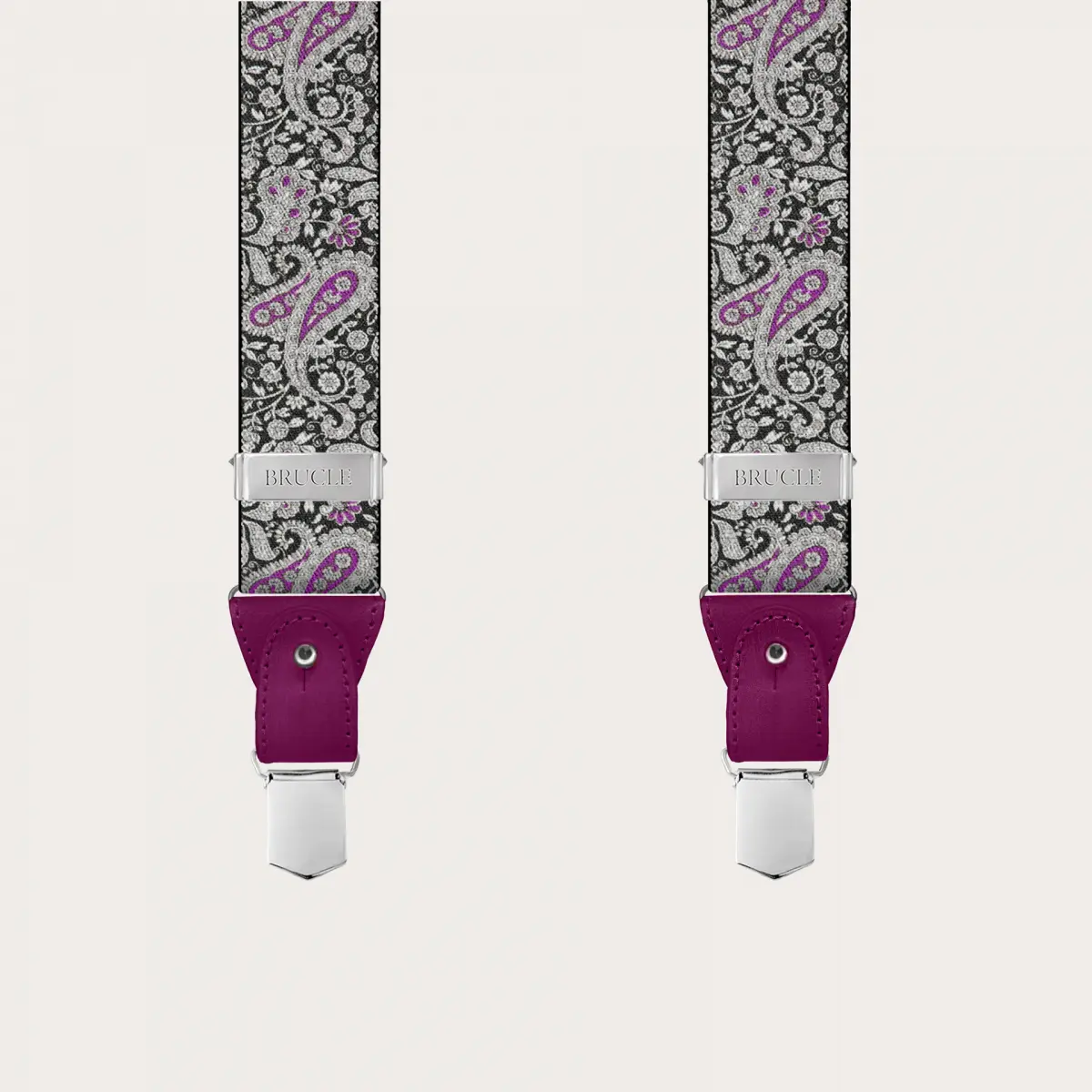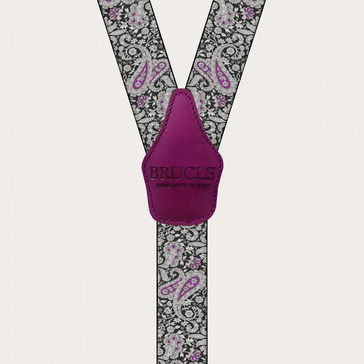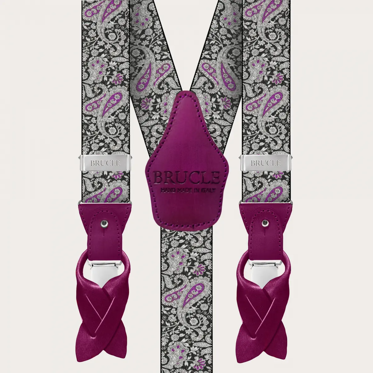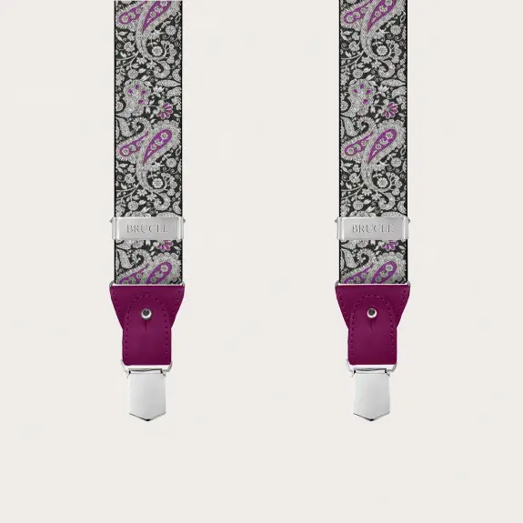 Double use braces suspenders with paisley pattern with a lively and refined magenta and black paisley motif, made unique by hand-colored yellow leather parts. A nickel free model, 100% Made in Italy.
