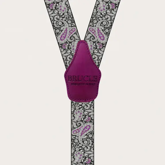 Double use suspenders in cashmere, black and purple pattern