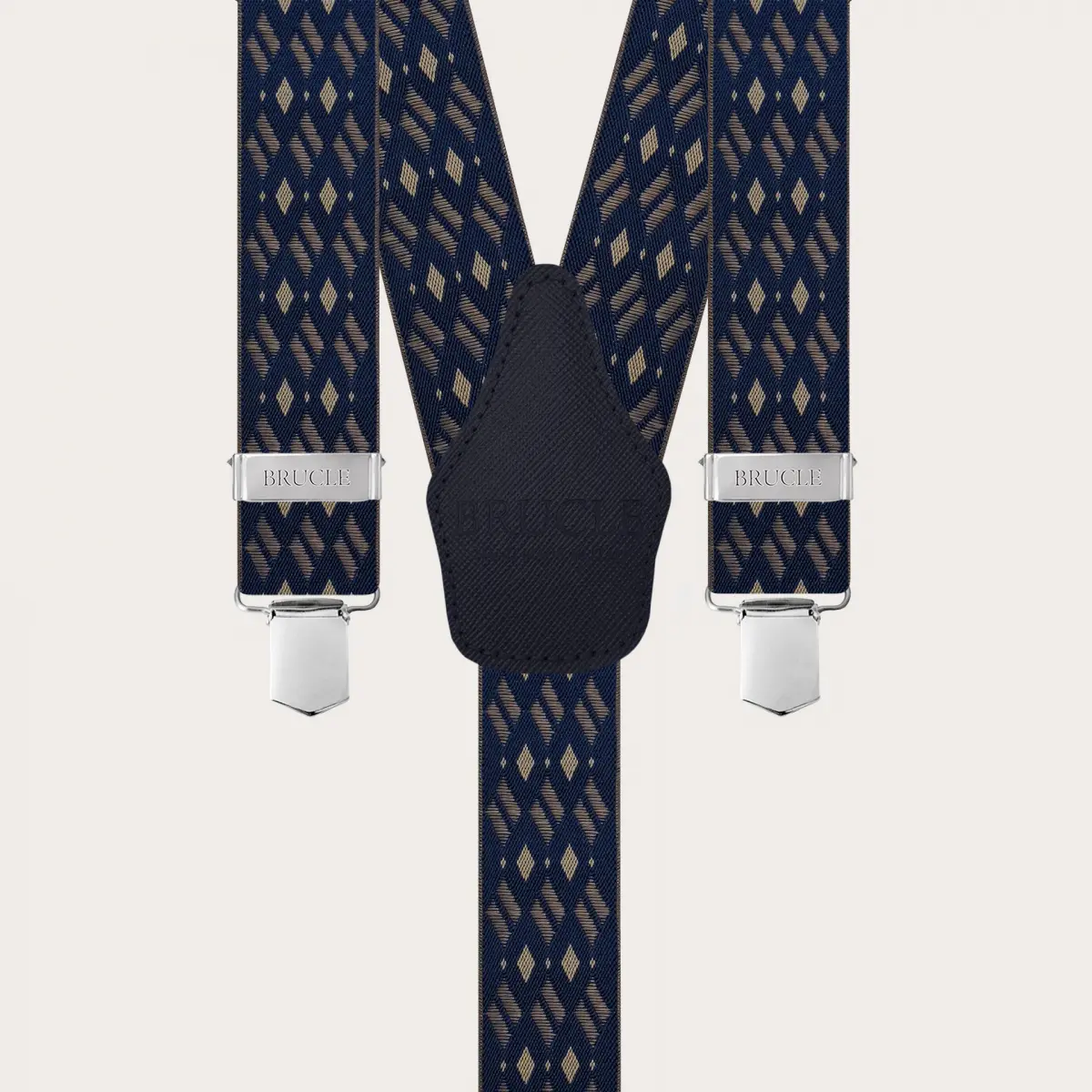 Wide elastic blue and beige diamond-pattern suspenders with clips