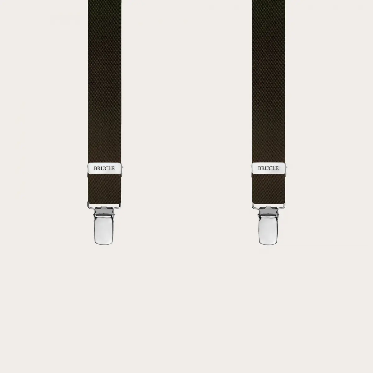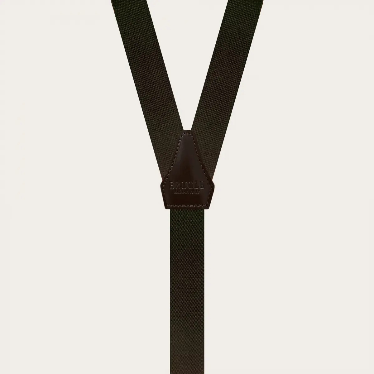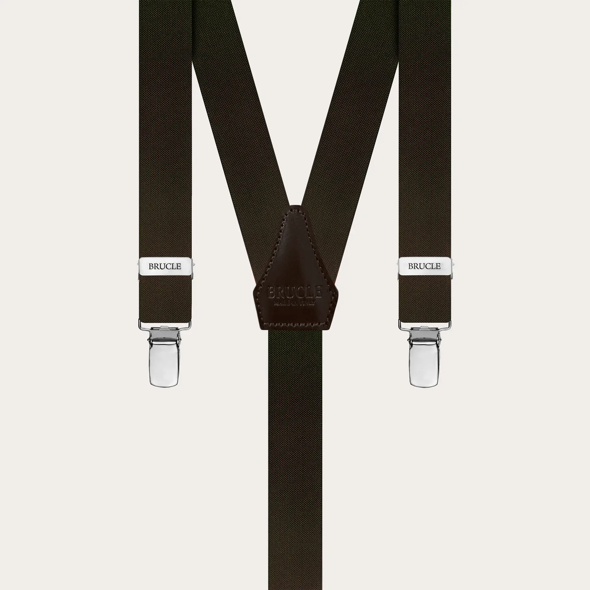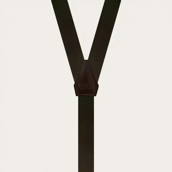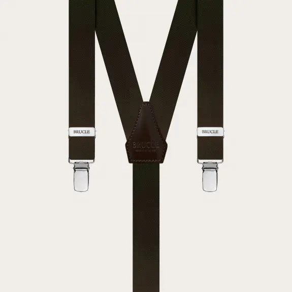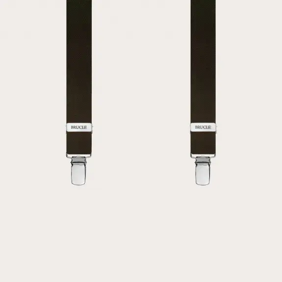 Style: Y-back suspenders with three legs Usage: clip Elastic composition: 85% Polyester 15% Elastodiene Back strap in genuine bovine leather Elastic width: 25 mm Adjustable length: 120 cm Color: dark brown Clip color: silver Clips with riveted rubber for better grip and durability. They do not damage your pants High-quality elastic and accessories 100% handmade in Italy