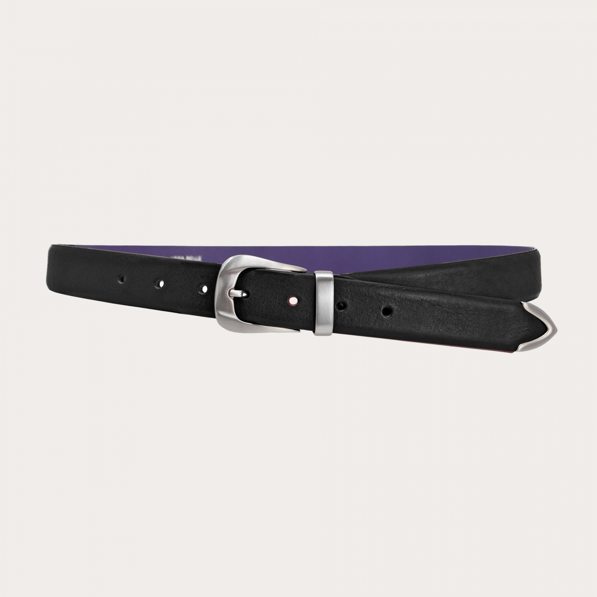 Contemporary black leather belt made from vegetable-tanned hide, featuring a looped satin brass buckle and matching tip. A sharp, stylish choice for formal or smart streetwear looks. Designed and handcrafted in Italy by BRUCLE.