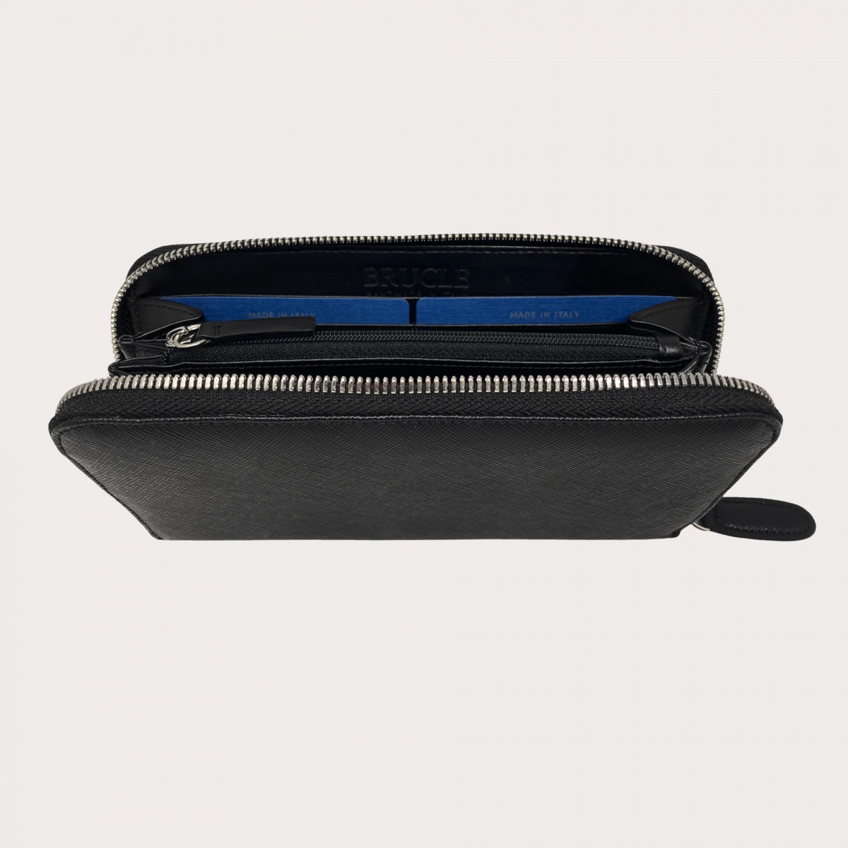 Zip around wallet with brass zip in genuine Saffiano print leather from the new BRUCLE wallet collection.
