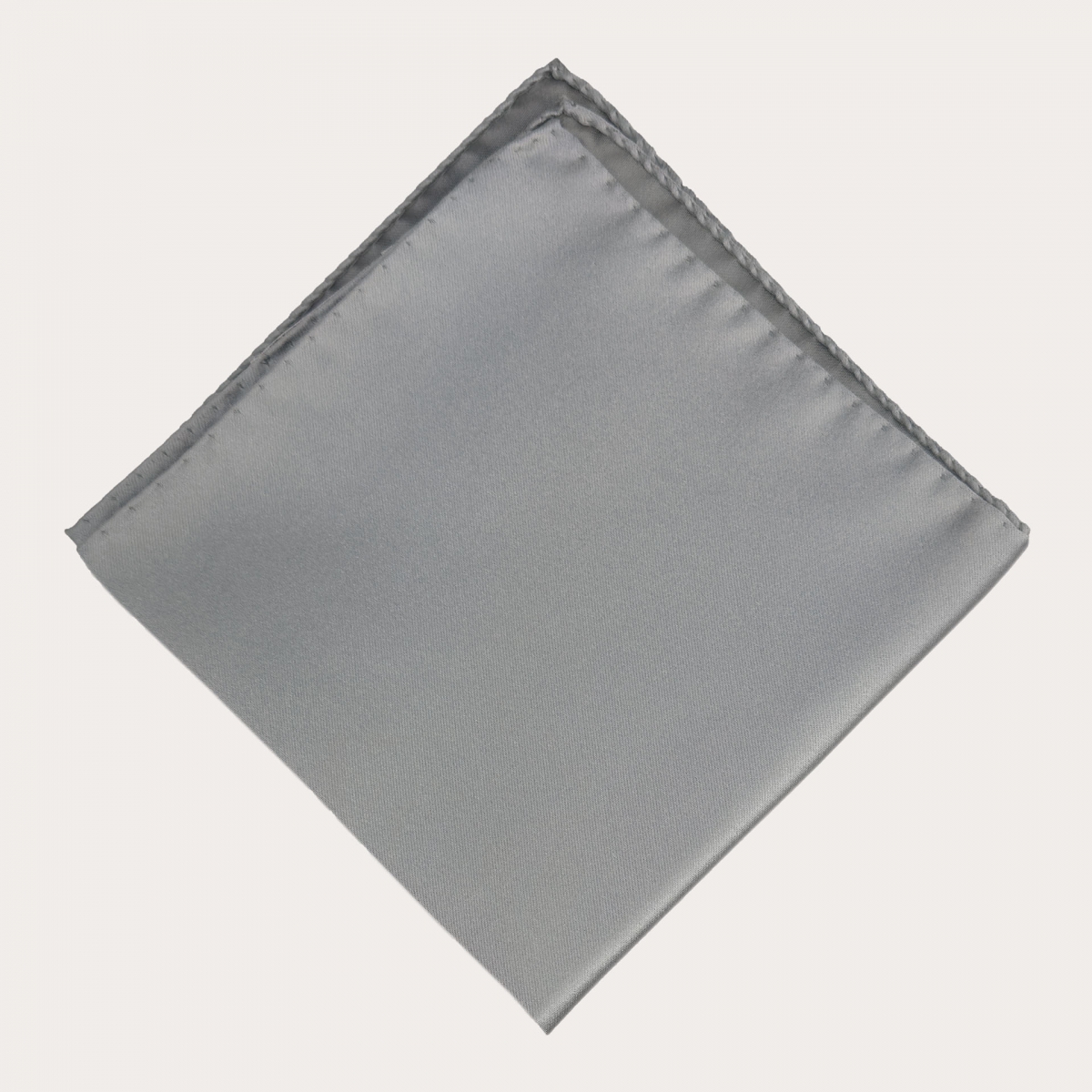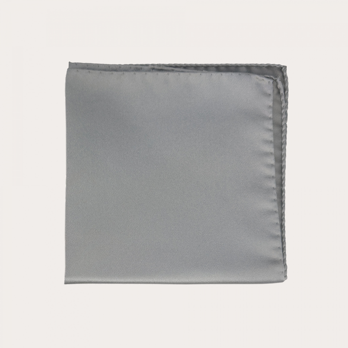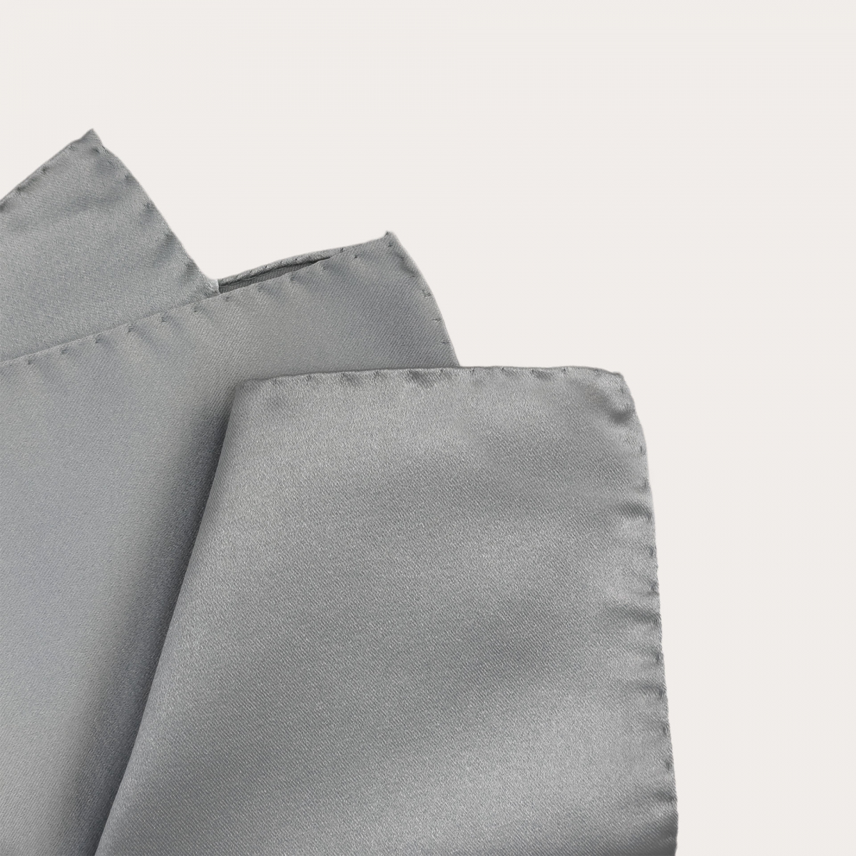 Light grey pocket square in silk satin: a must-have for your ceremonies and formal events. The silver grey color is enhanced by the shine of the pure silk satin of high quality woven in Como. The edge of this pocket square is hand-rolled and machine-stitched to ensure you a superior quality product. Discover also the silk coordinates such as suspenders, ties, and bow ties, for a total look of elegance.