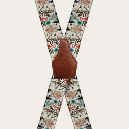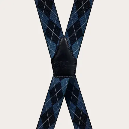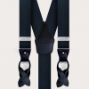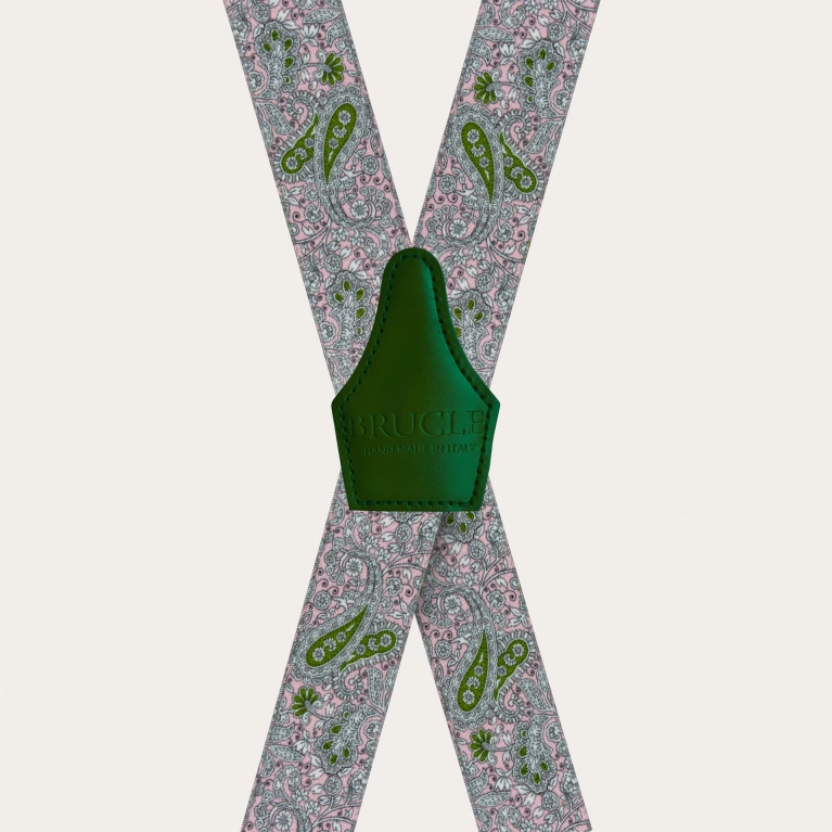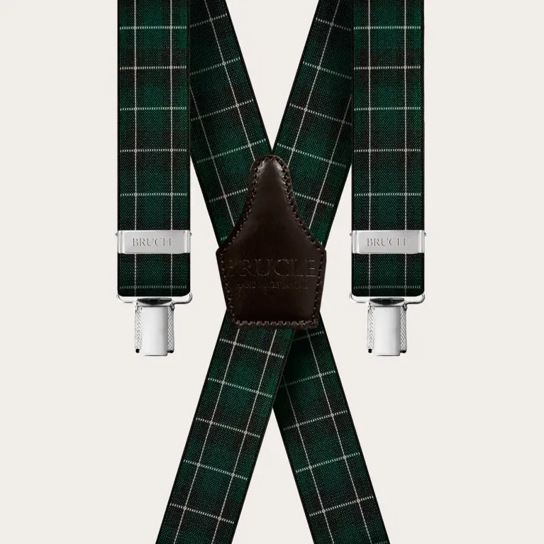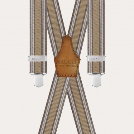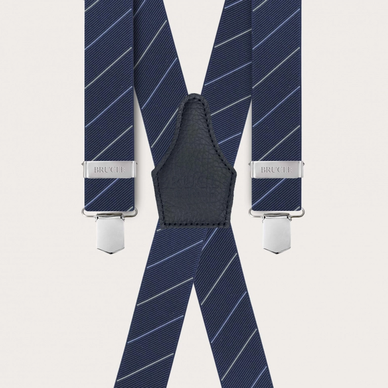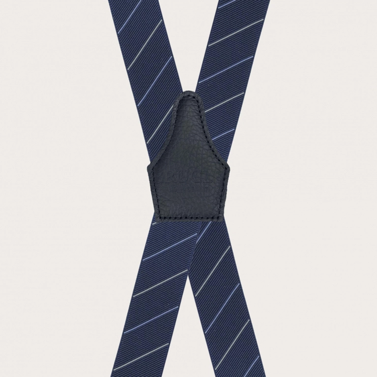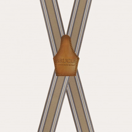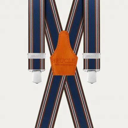 Elastic X-shaped suspenders with vertical blue and green stripes and a back panel in hand-colored genuine leather.