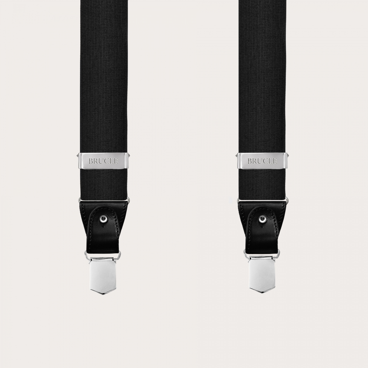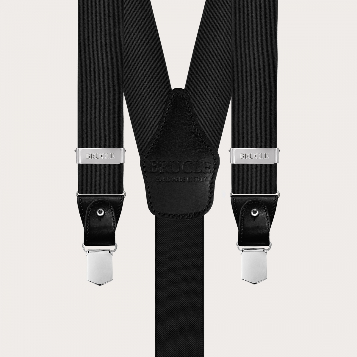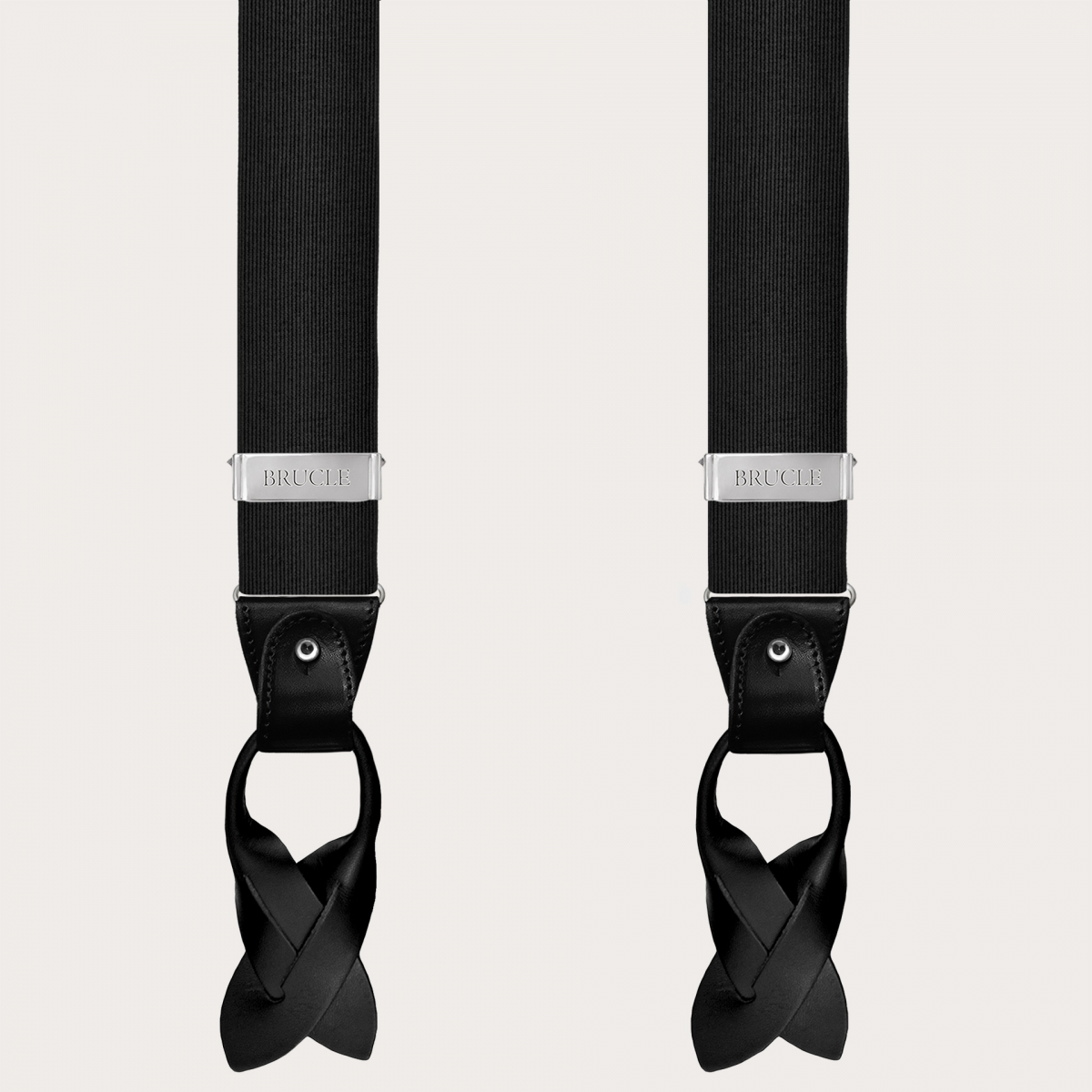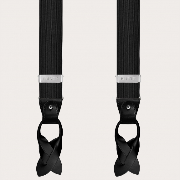 Brucle black silk suspenders, an icon of luxury and artisanal style Made in Italy. Elevate your outfit with the refinement and high quality of these unique and sophisticated silk suspenders.